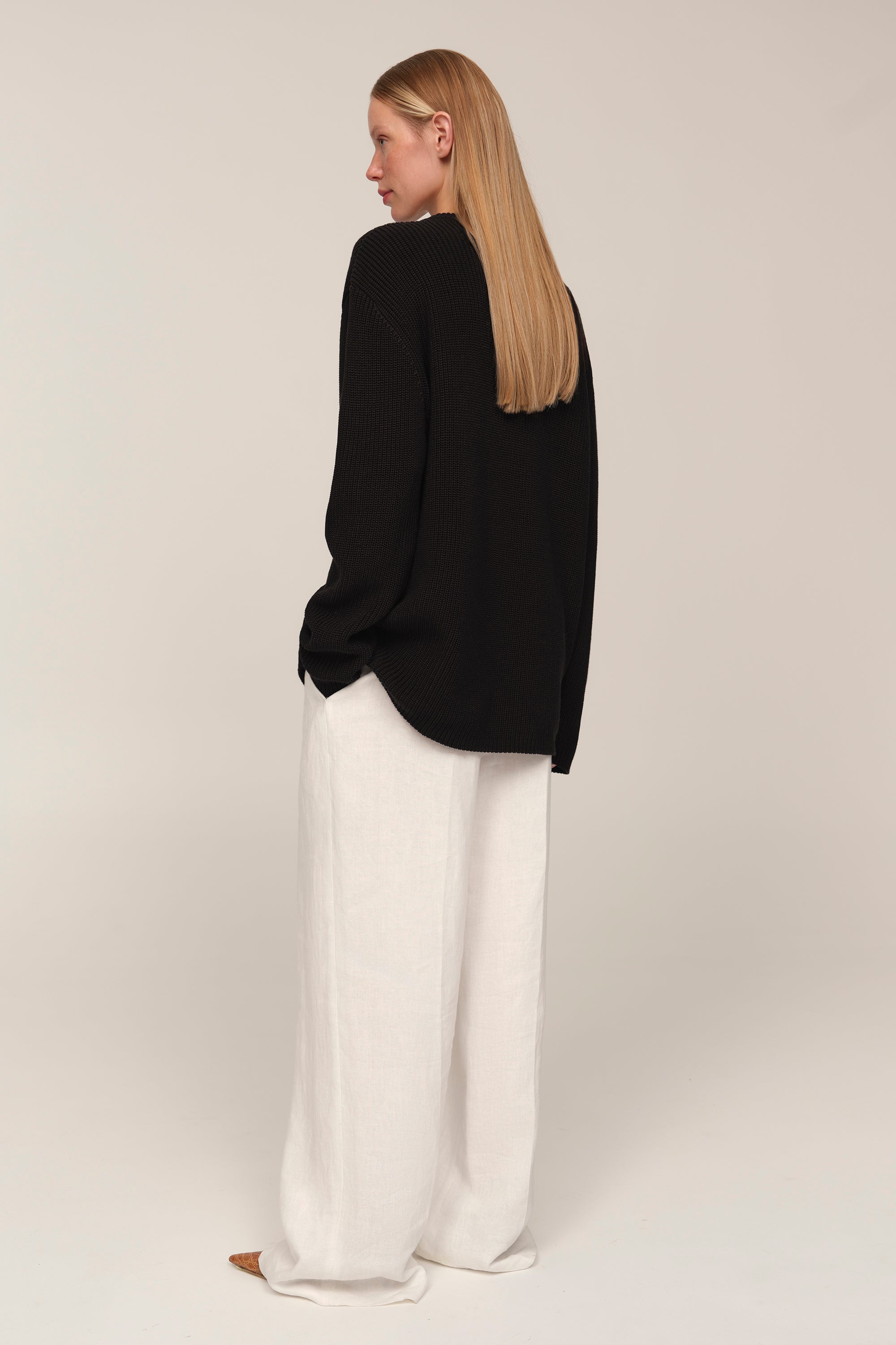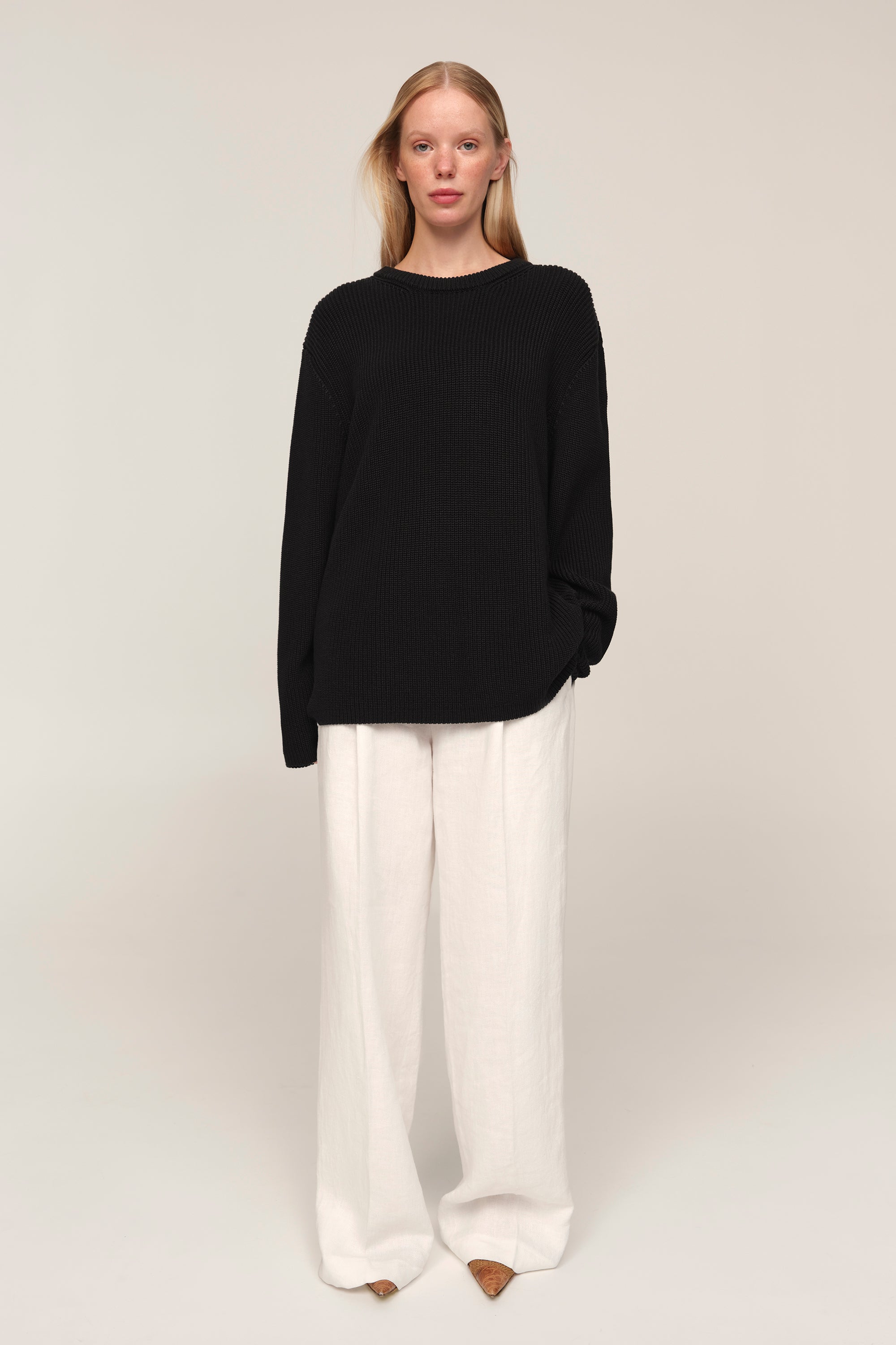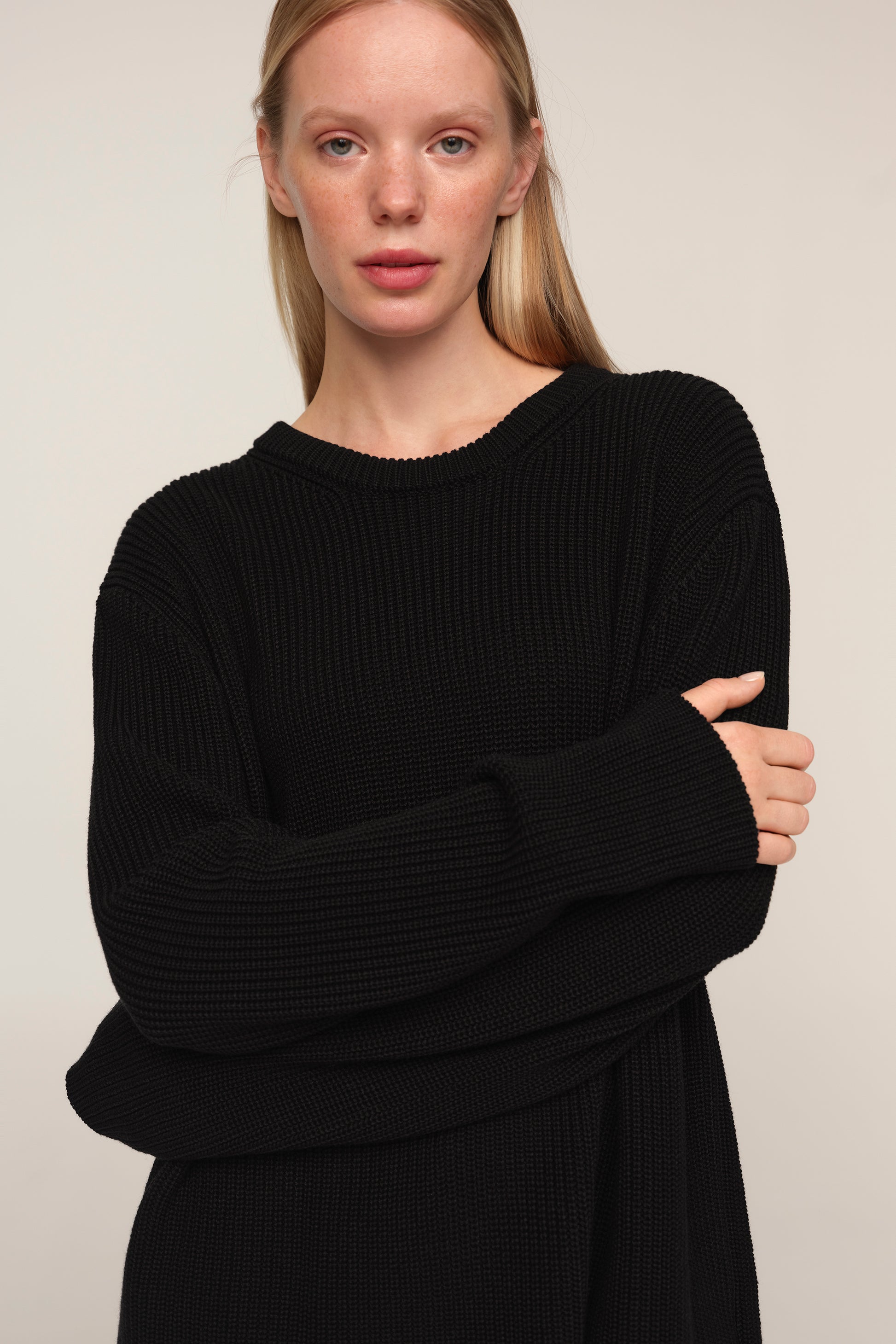 Kaia — светр із бавовни, у якому відчувається чесність матеріалу й чистота форми. Його об’єм підкреслений структурною в’язкою, що додає глибини силуету, а подовжені рукава додають розслабленості образу. Вільна посадка дозволяє легко інтегрувати светр у багатошарові поєднання або носити його як самостійну річ. Це не просто база, а річ, яка тримає форму гардеробу — стримана, але водночас виразна у деталях.