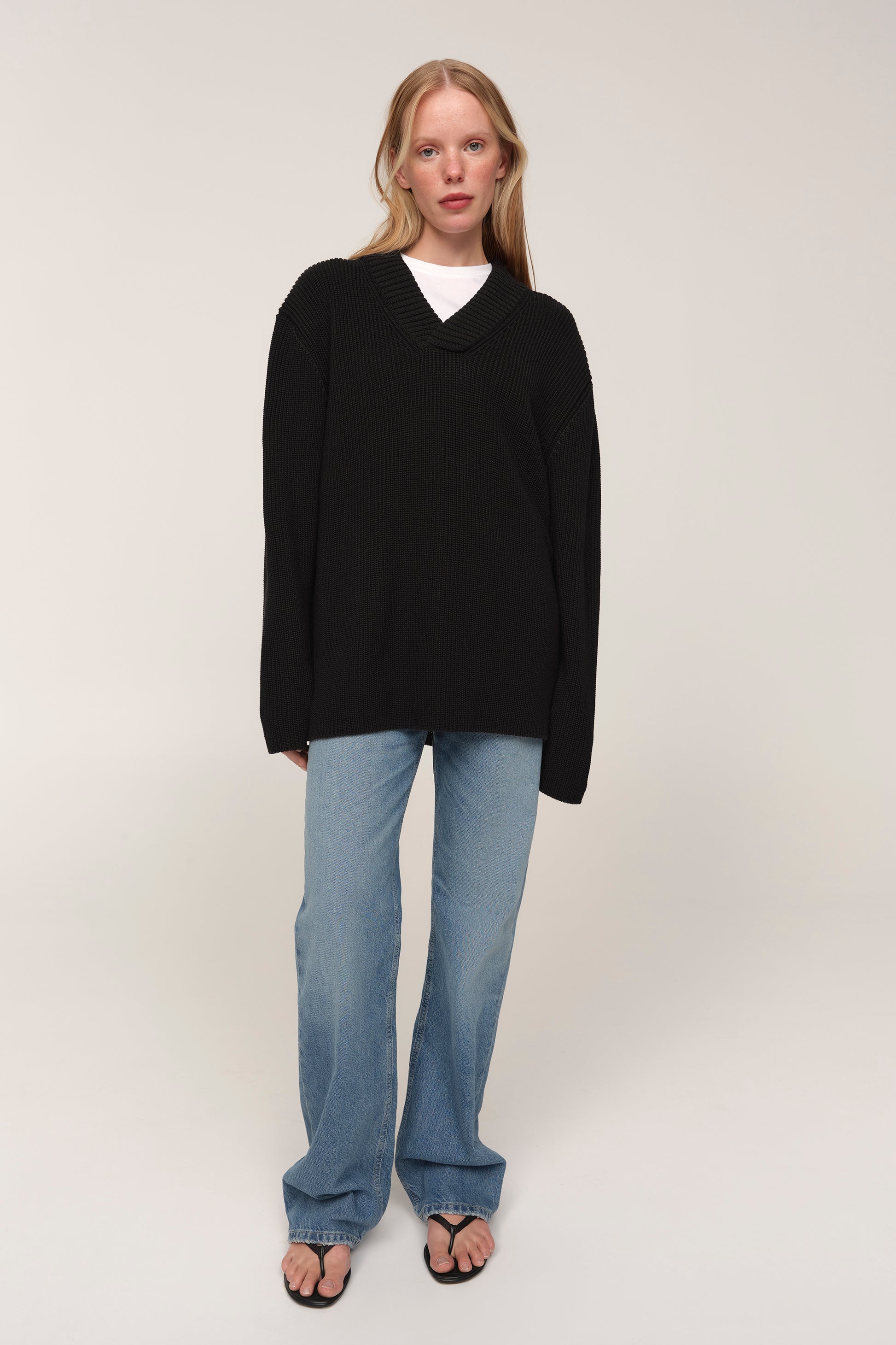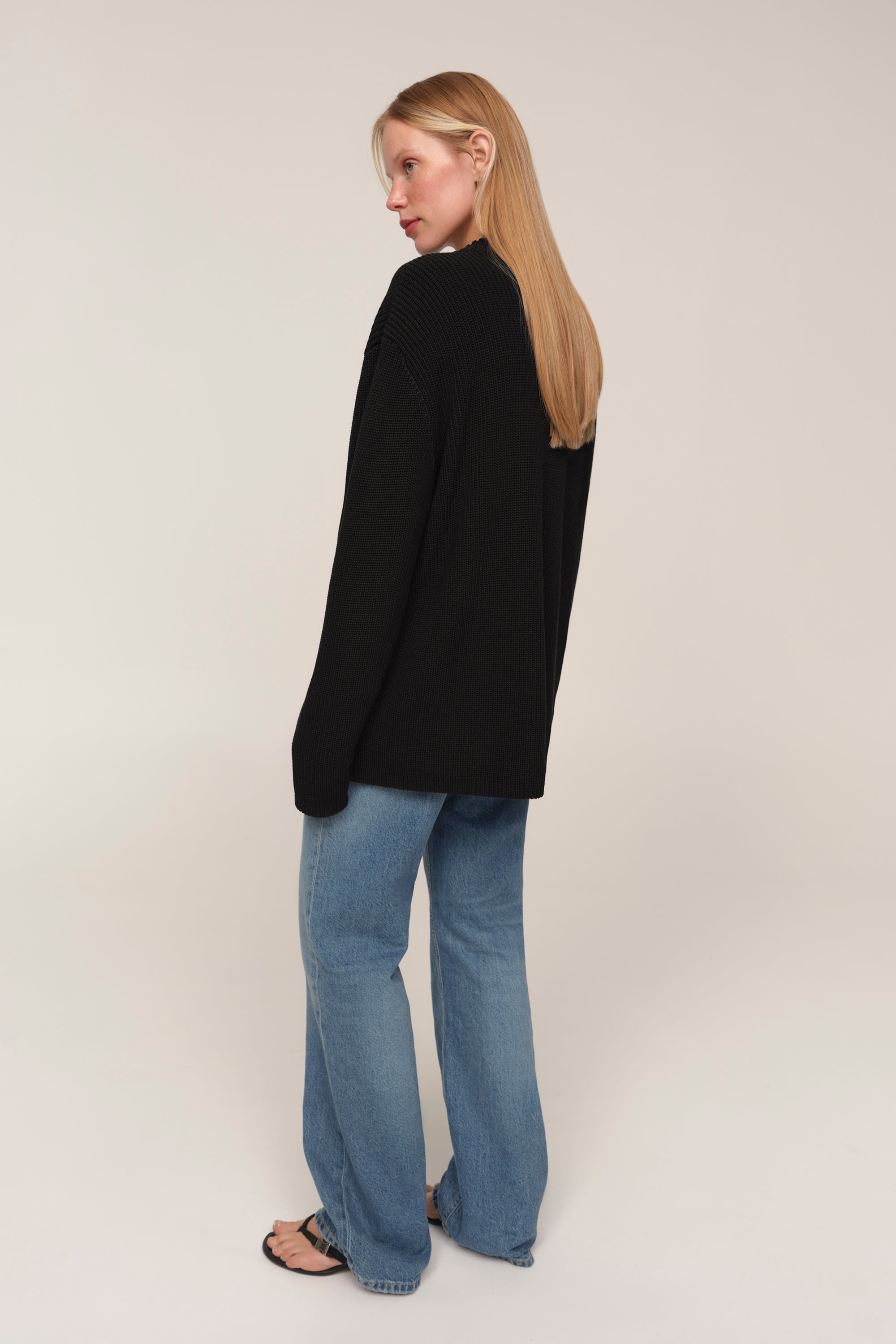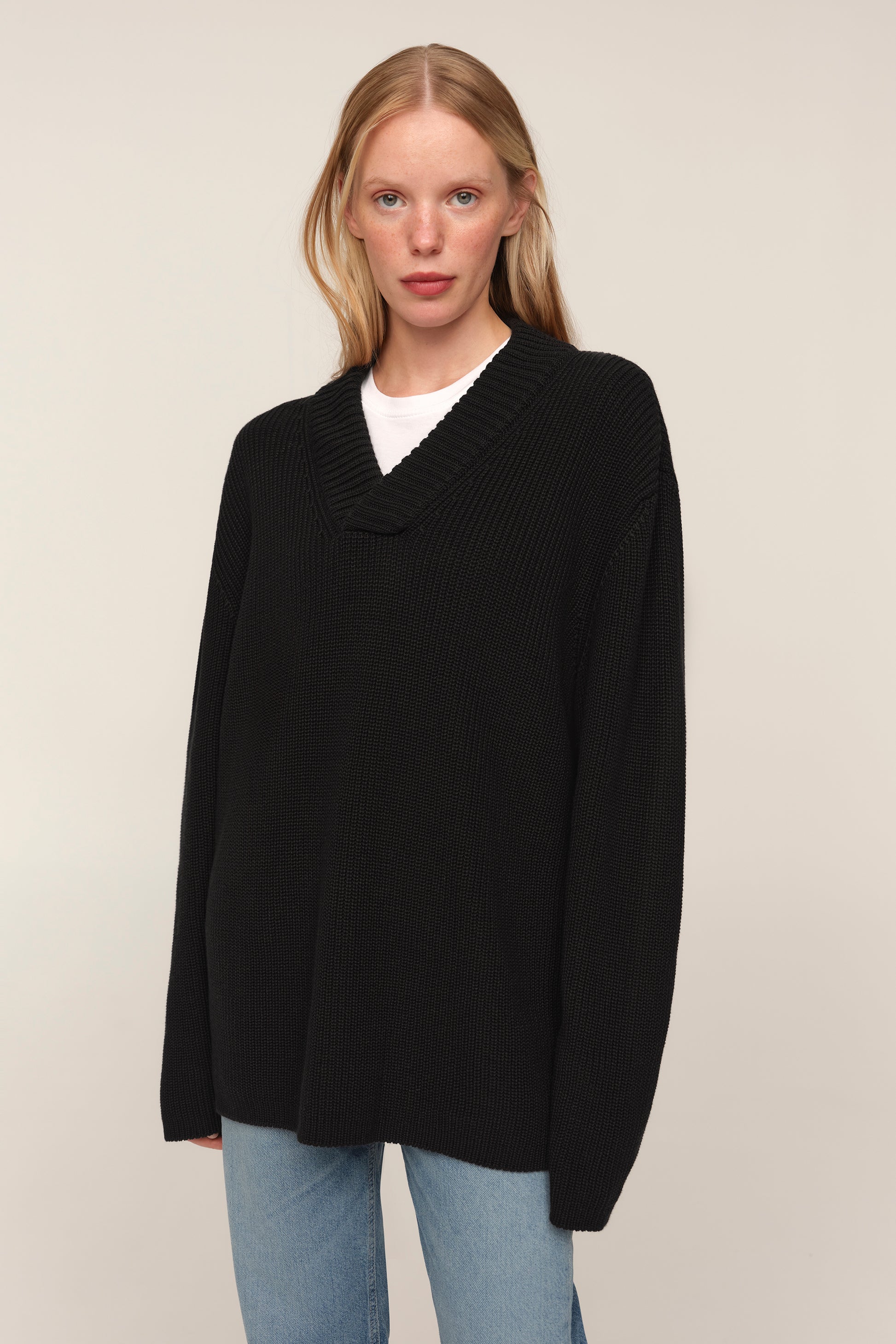 Створюючи цей бавовняний светр, ми свідомо працювали з пропорціями: подовжили виріб, щоб силует мав більш виразну і впевнену лінію, а глибину вирізу витримали стримано — для балансу. Комір обрамлює шию з легкою чіткістю, додаючи образу зосередженості.