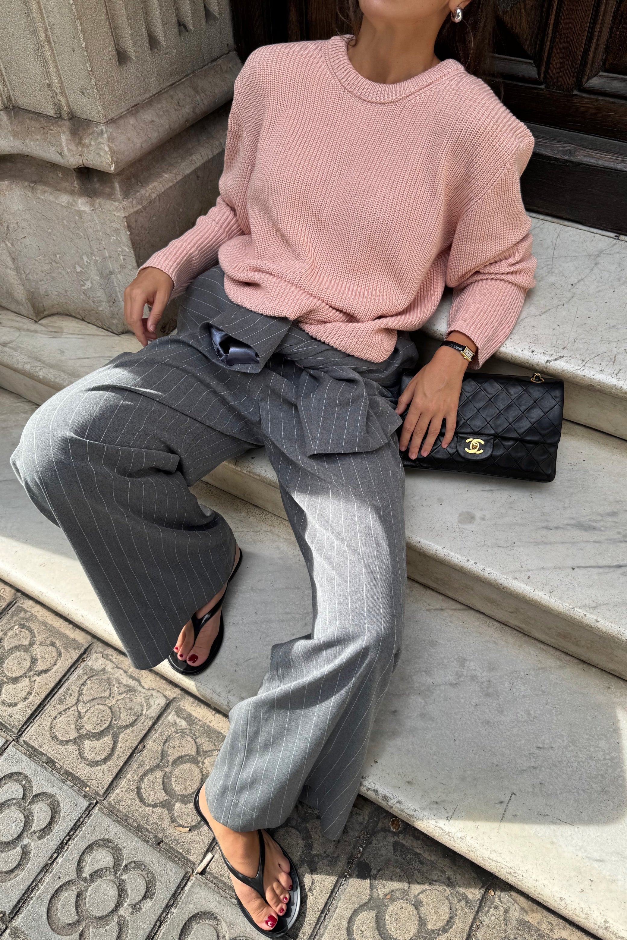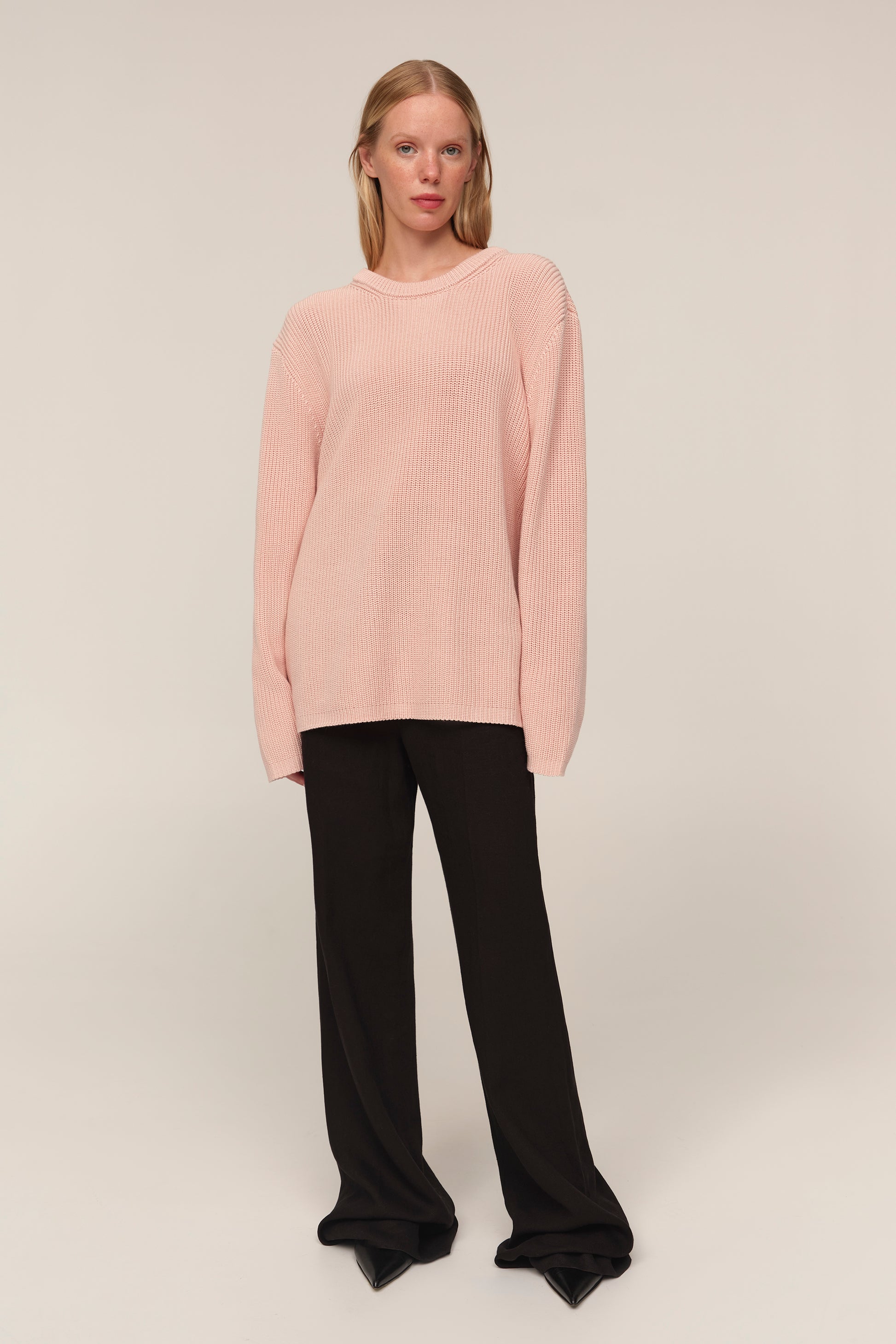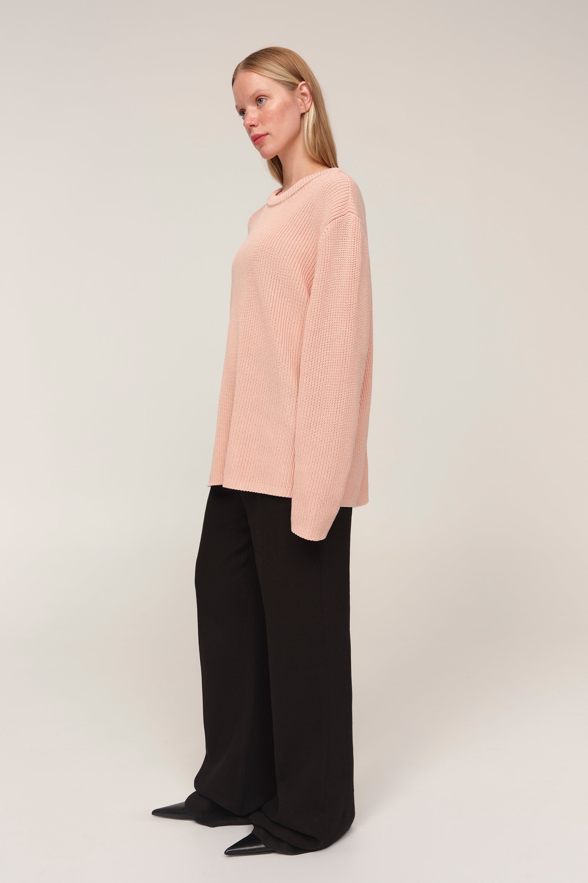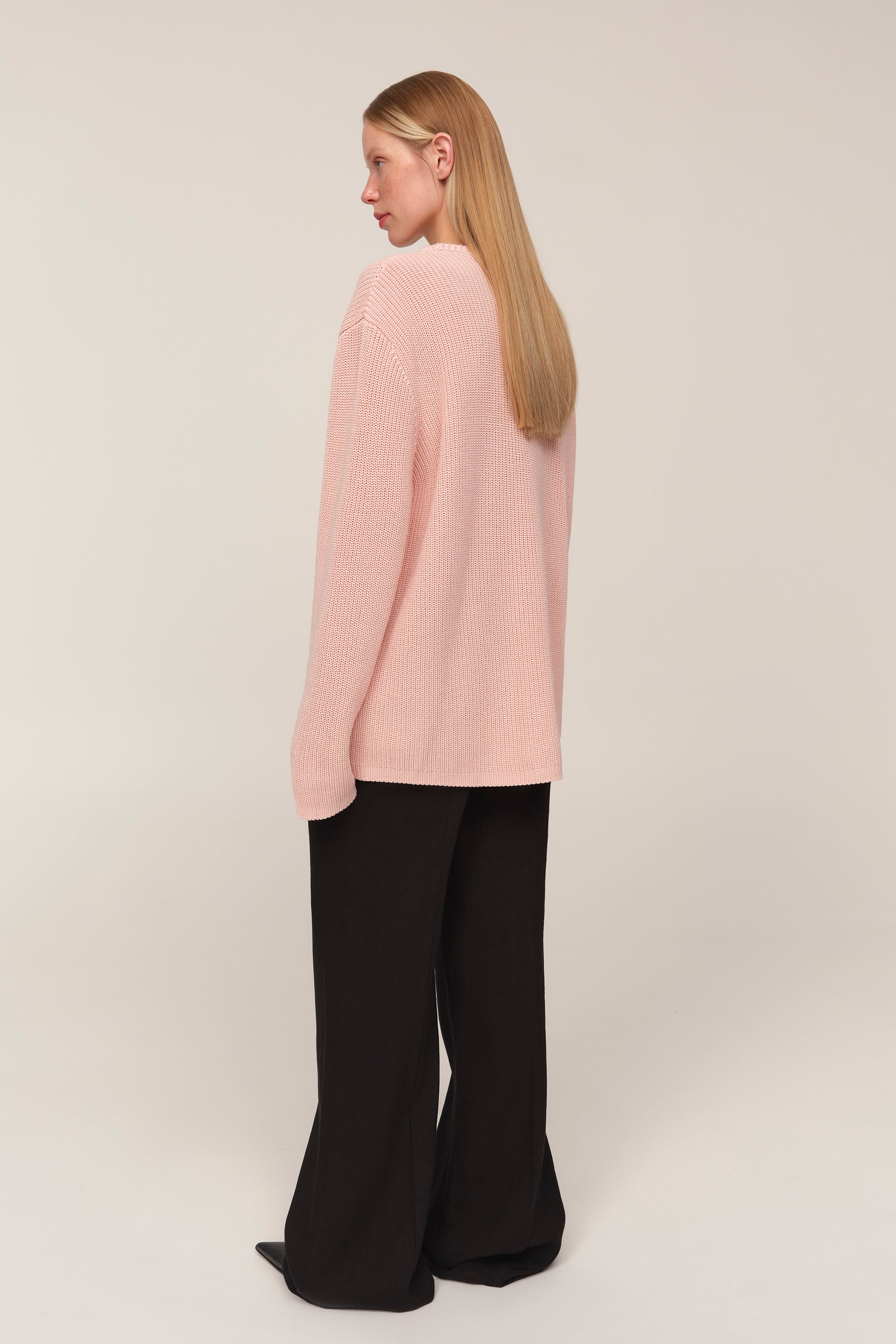 Kaia — светр із бавовни, у якому відчувається чесність матеріалу й чистота форми. Його об’єм підкреслений структурною в’язкою, що додає глибини силуету, а подовжені рукава додають розслабленості образу. Вільна посадка дозволяє легко інтегрувати светр у багатошарові поєднання або носити його як самостійну річ. Це не просто база, а річ, яка тримає форму гардеробу — стримана, але водночас виразна у деталях.