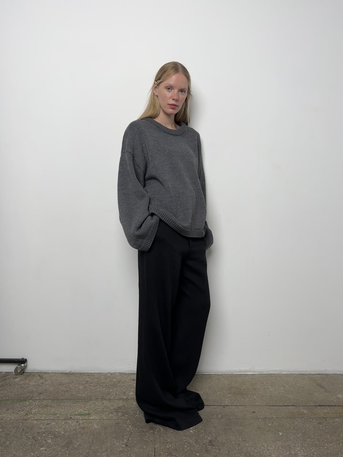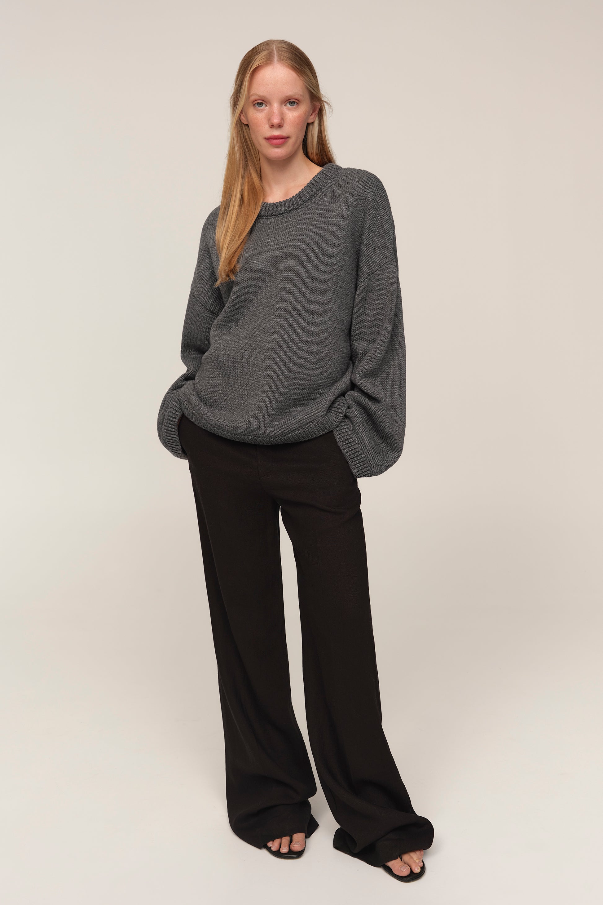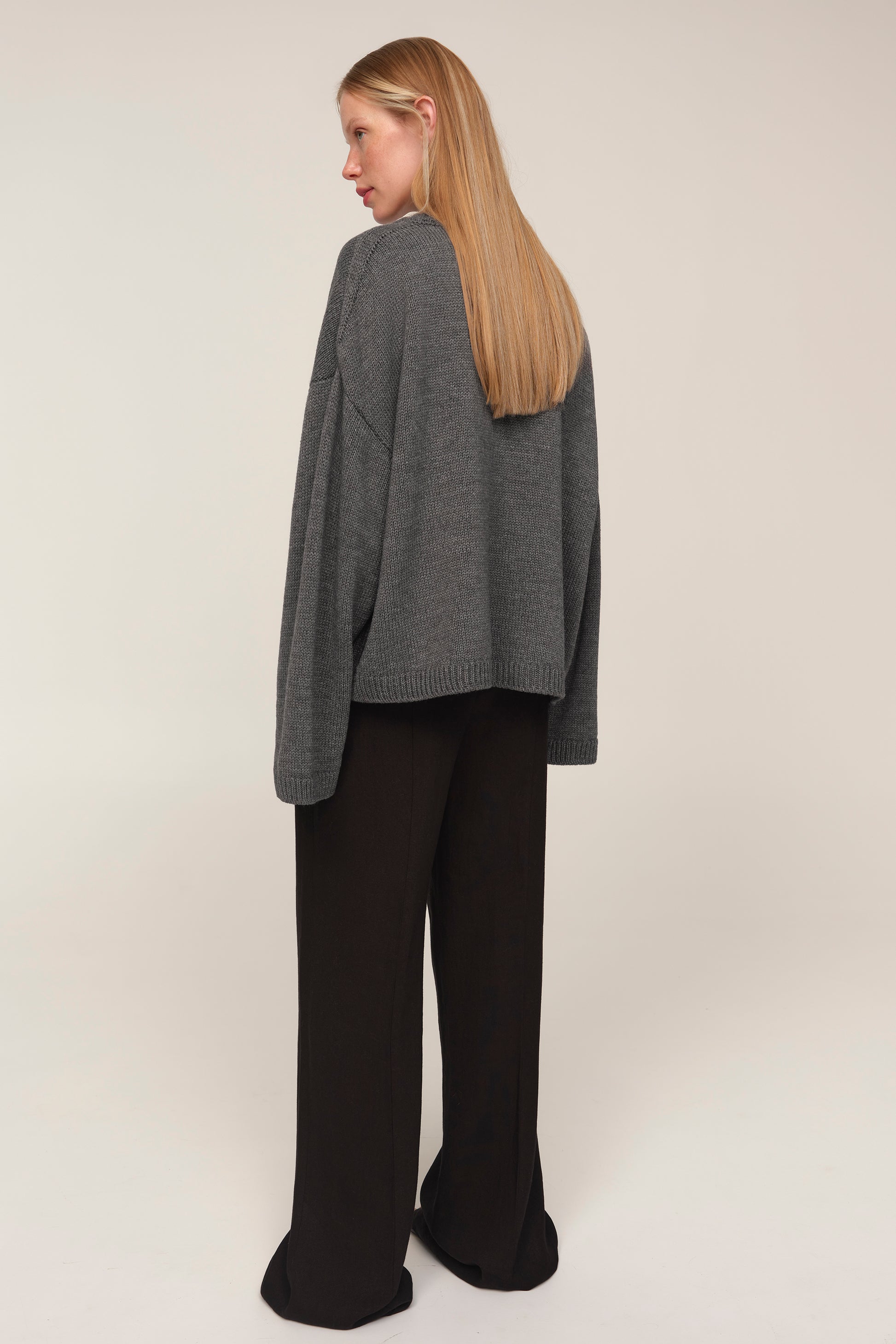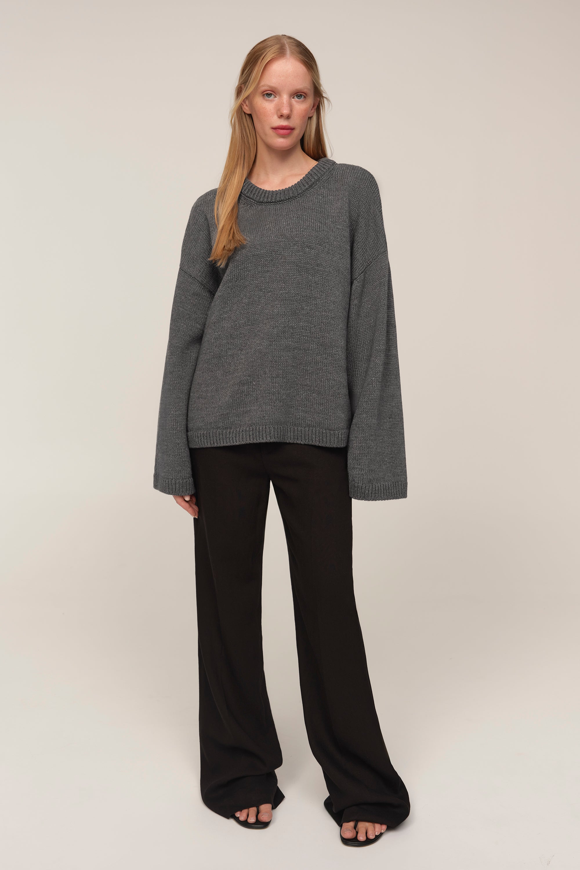 Elva — светр, що поєднує свободу та графічність форми. Його укорочена довжина врівноважує об’ємні рукава й занижене плече, створюючи актуальний силует із легкою архітектурою. Мериносова вовна додає балансу між теплом і легкістю, перетворюючи Elva на светр, доречний і в базових поєднаннях з денімом, і в більш продуманих стилізаціях.