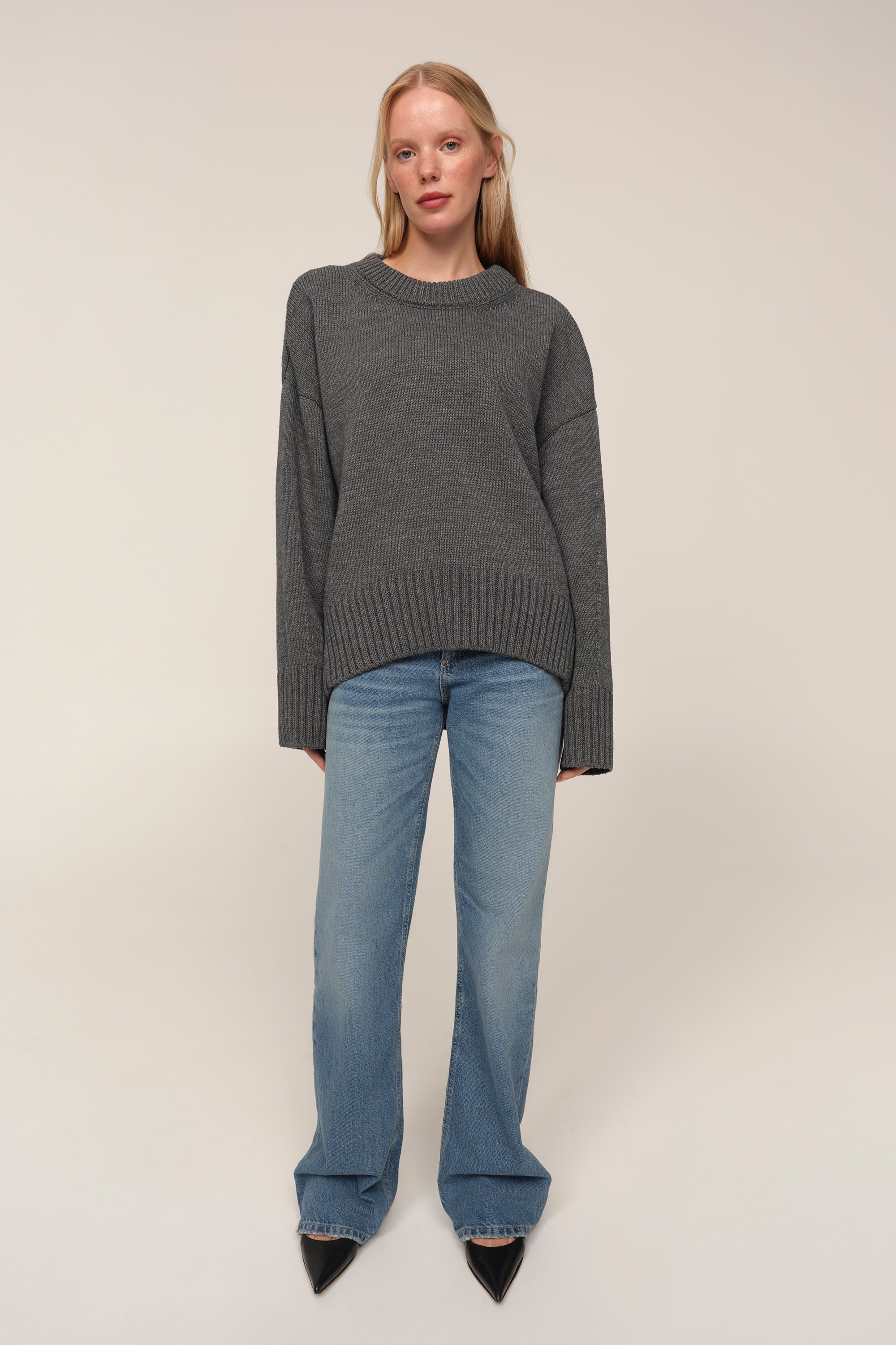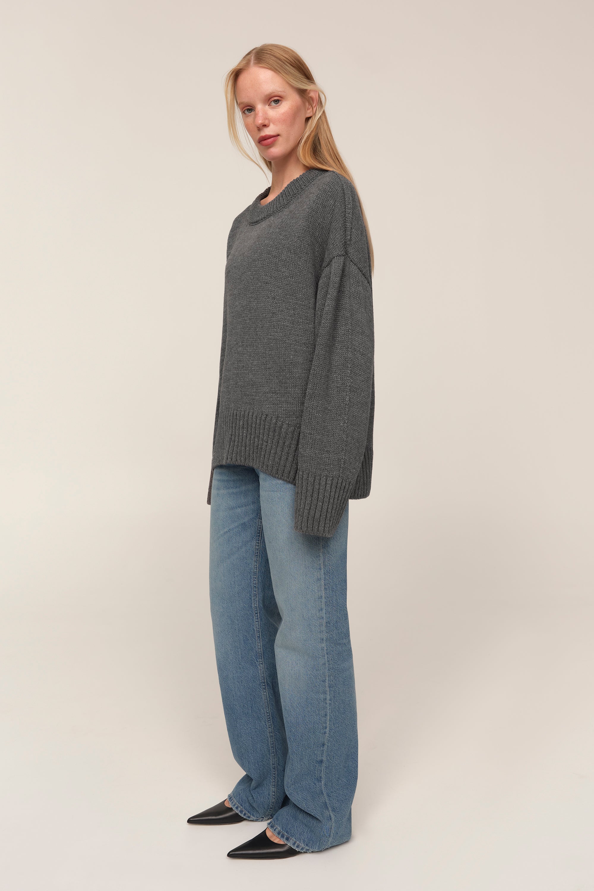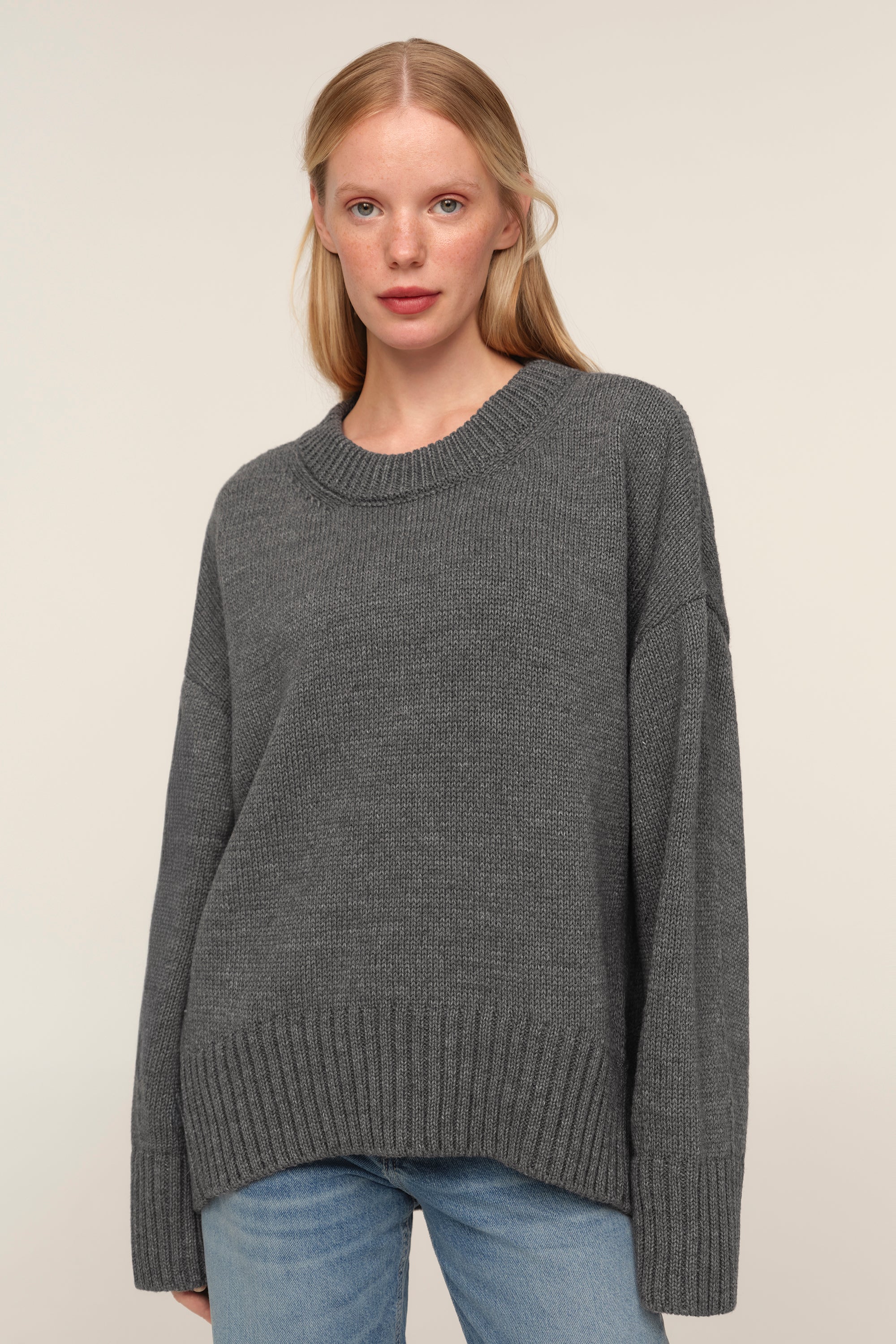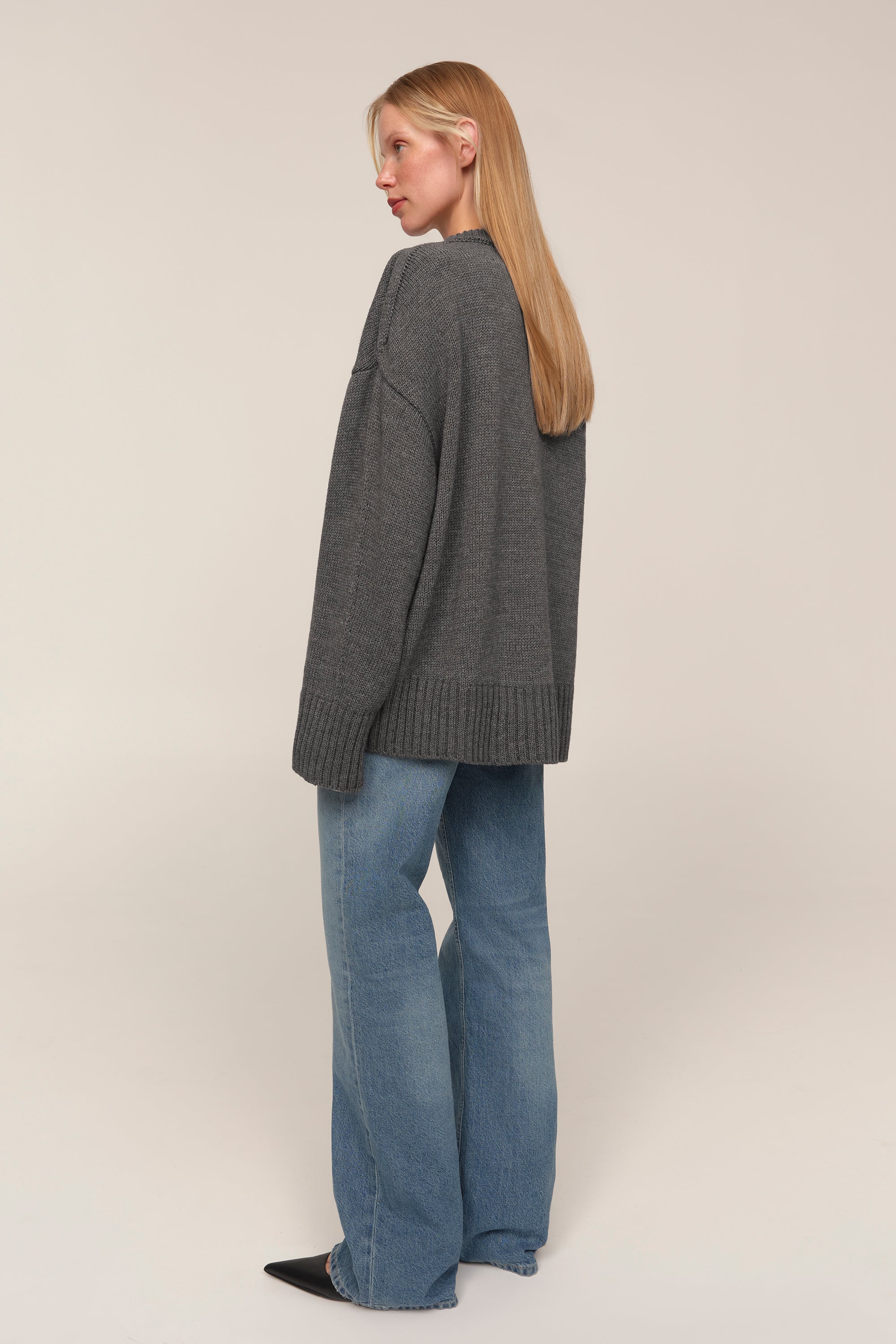 Sena — светр у його найчистішому значенні. Об’ємний силует, м’яке плетіння та виразна фактура роблять його річчю, яка сама формує образ. Асиметрія між передом і спинкою надає силуету виразності та підкреслює продуманість форми. Подовжені рукава створюють відчуття затишку, а завдяки мериносовій вовні светр відчувається особливо природним, додаючи тепла без зайвої ваги. Це не випадкова «база», а саме той светр, що стає опорою гардеробу: стриманий на перший погляд, але з характером, який розкривається у кожній комбінації.