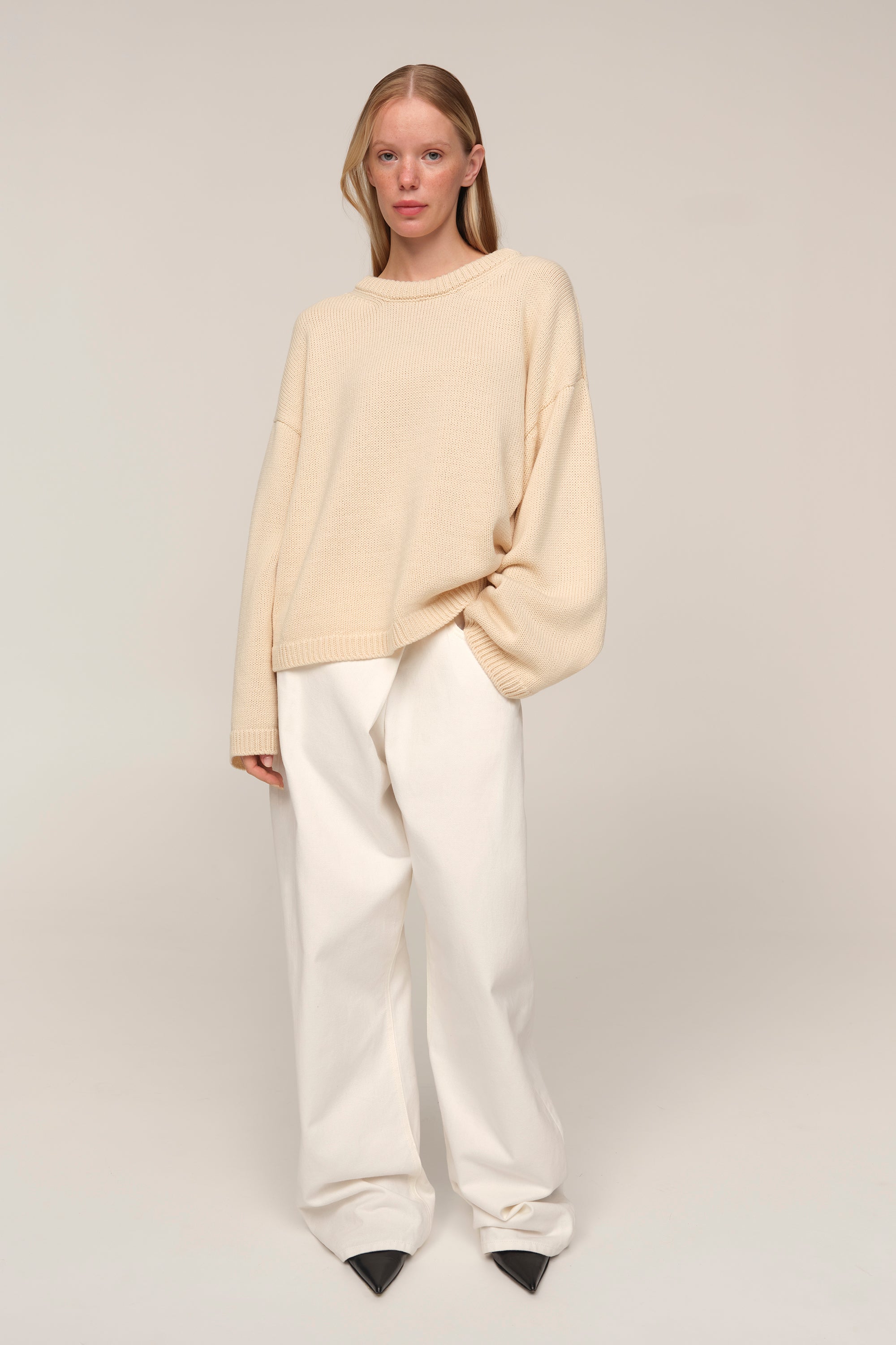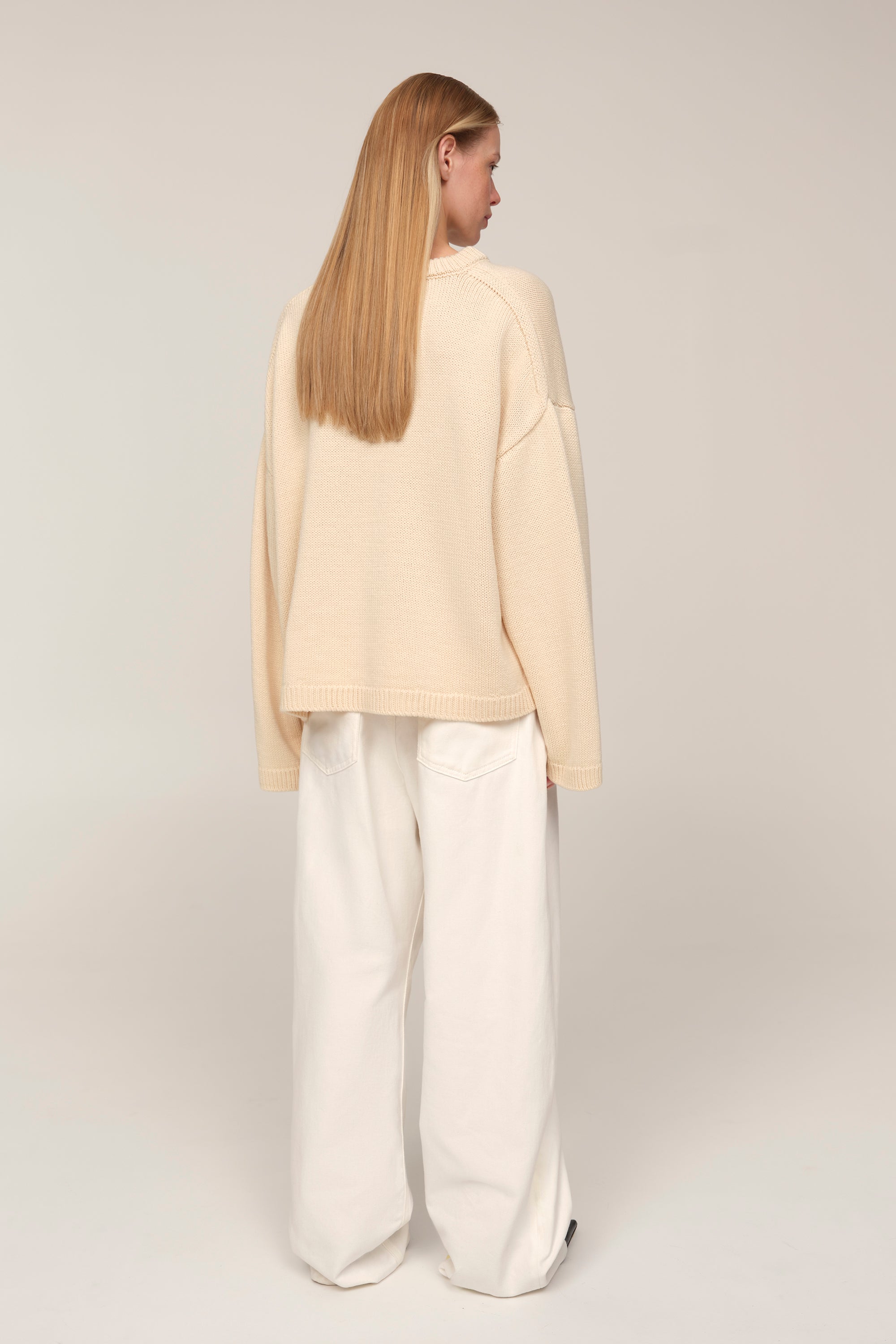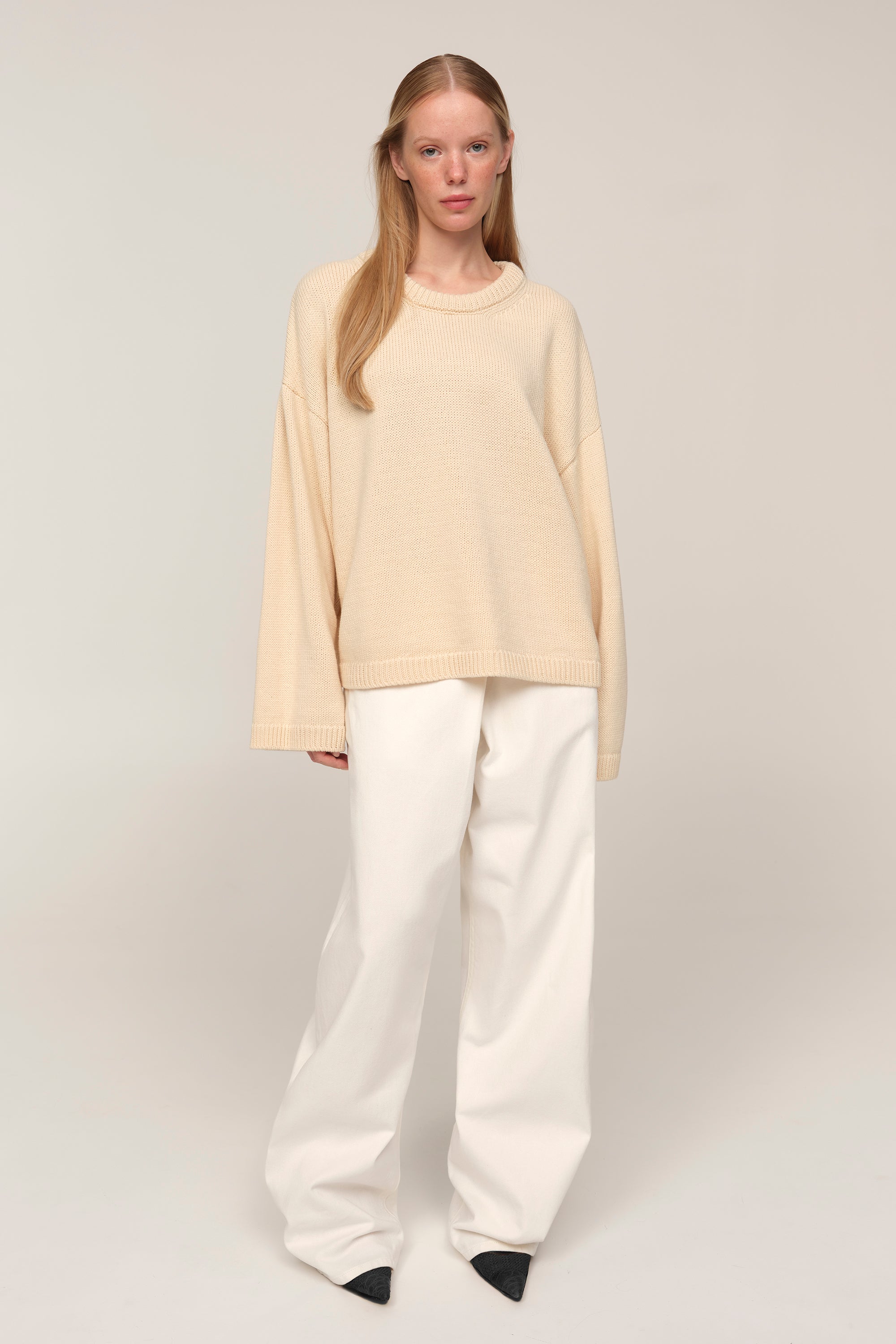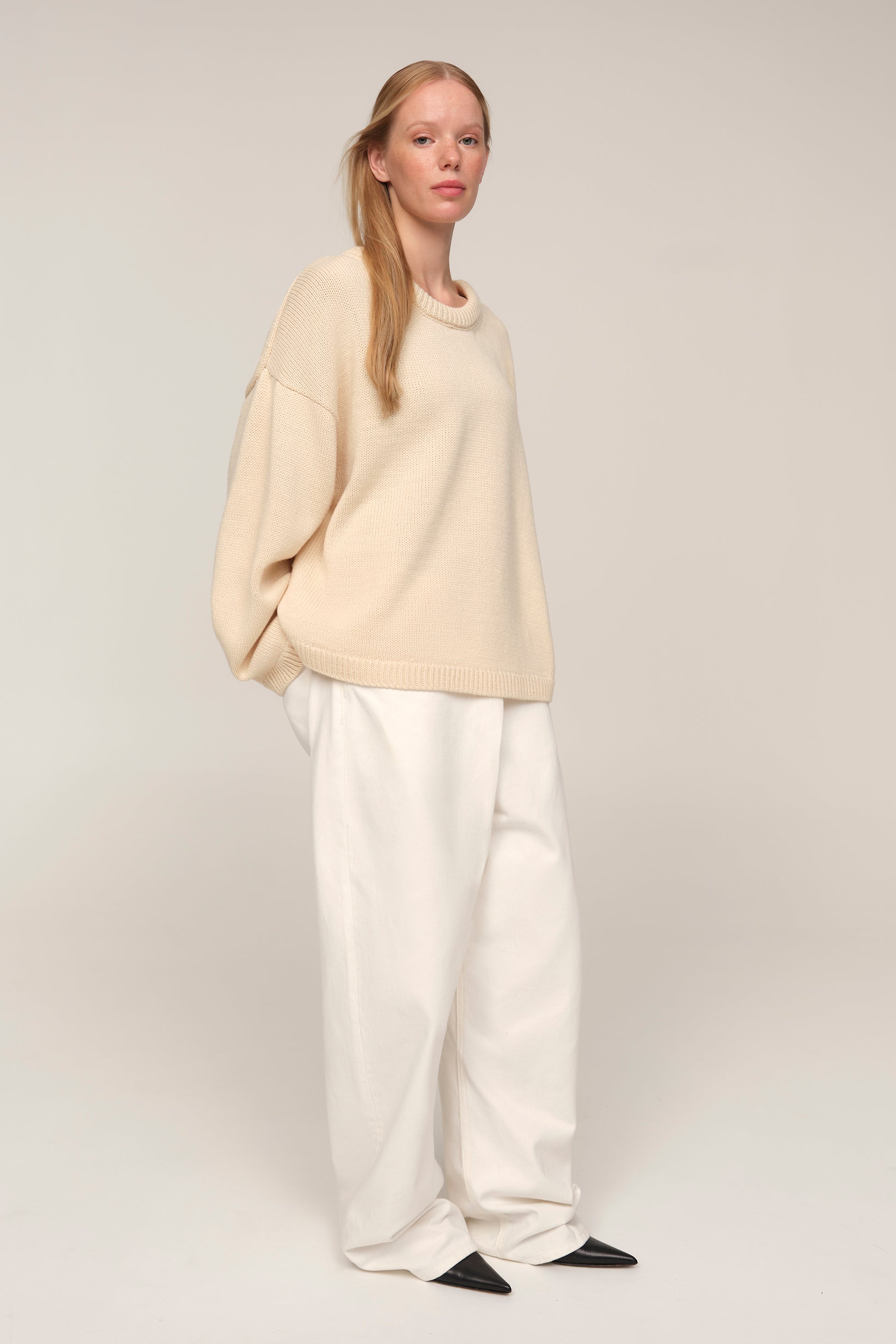 Elva — светр, що поєднує свободу та графічність форми. Його укорочена довжина врівноважує об’ємні рукава й занижене плече, створюючи актуальний силует із легкою архітектурою. Мериносова вовна додає балансу між теплом і легкістю, перетворюючи Elva на светр, доречний і в базових поєднаннях з денімом, і в більш продуманих стилізаціях.