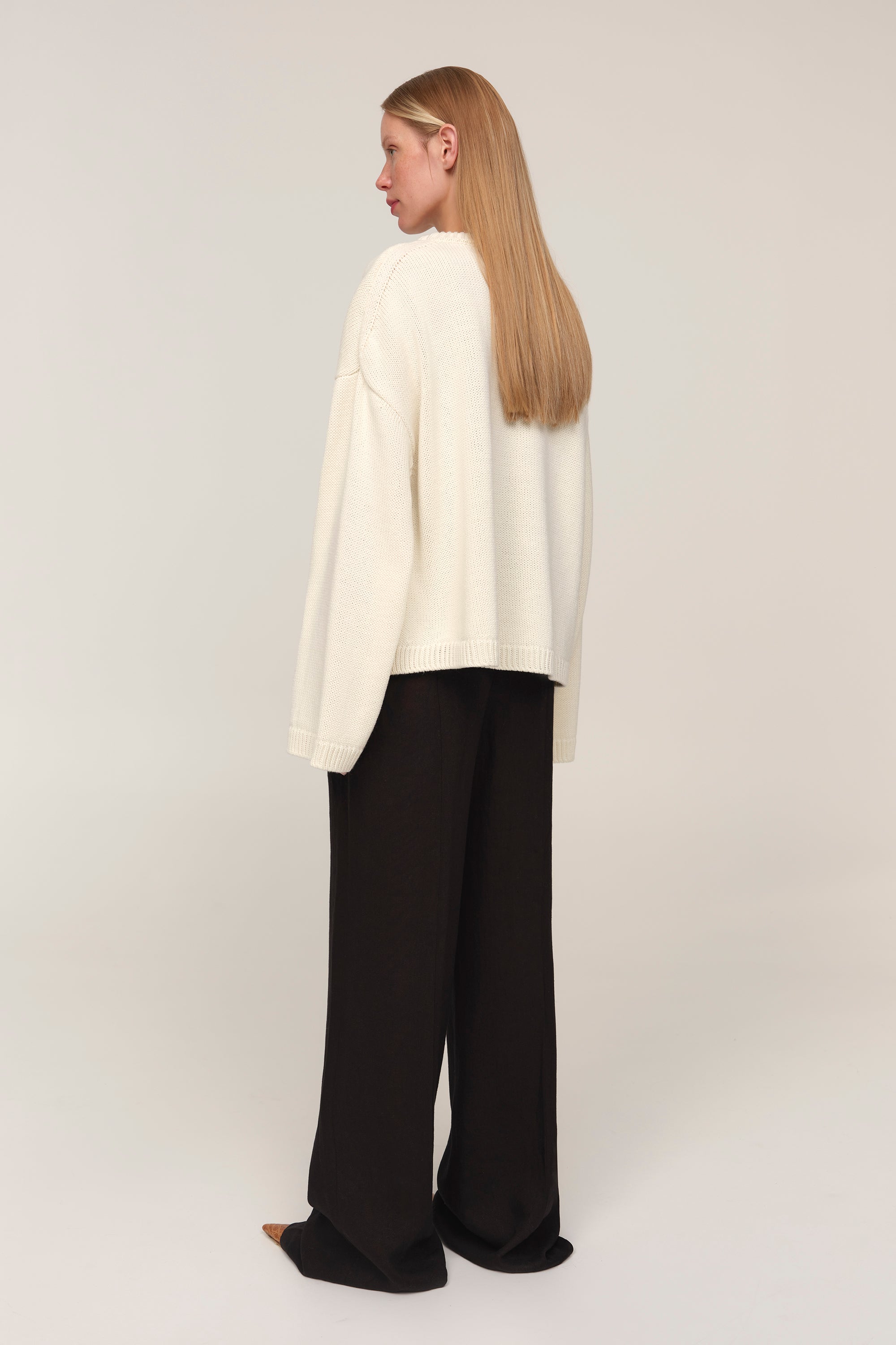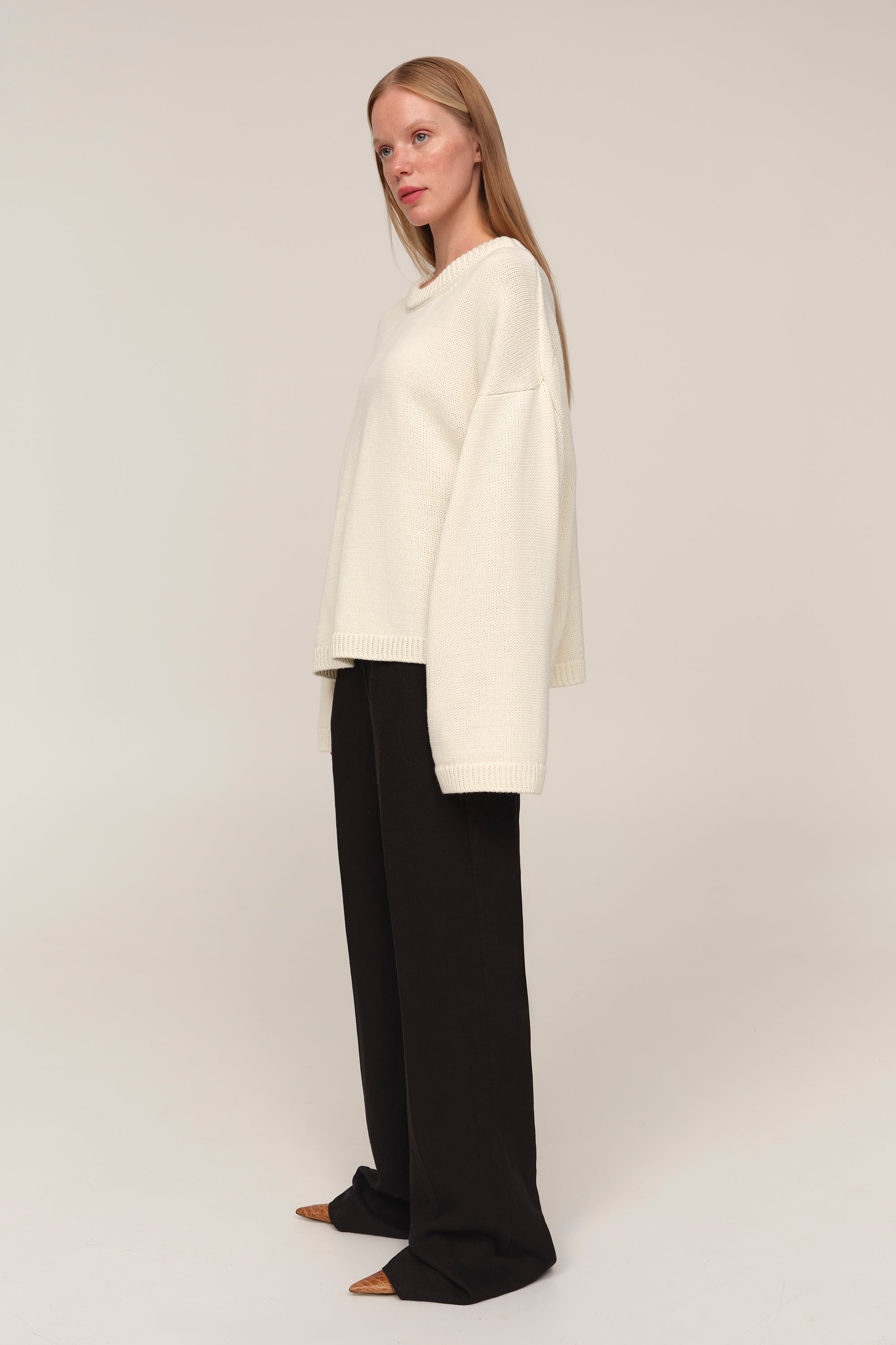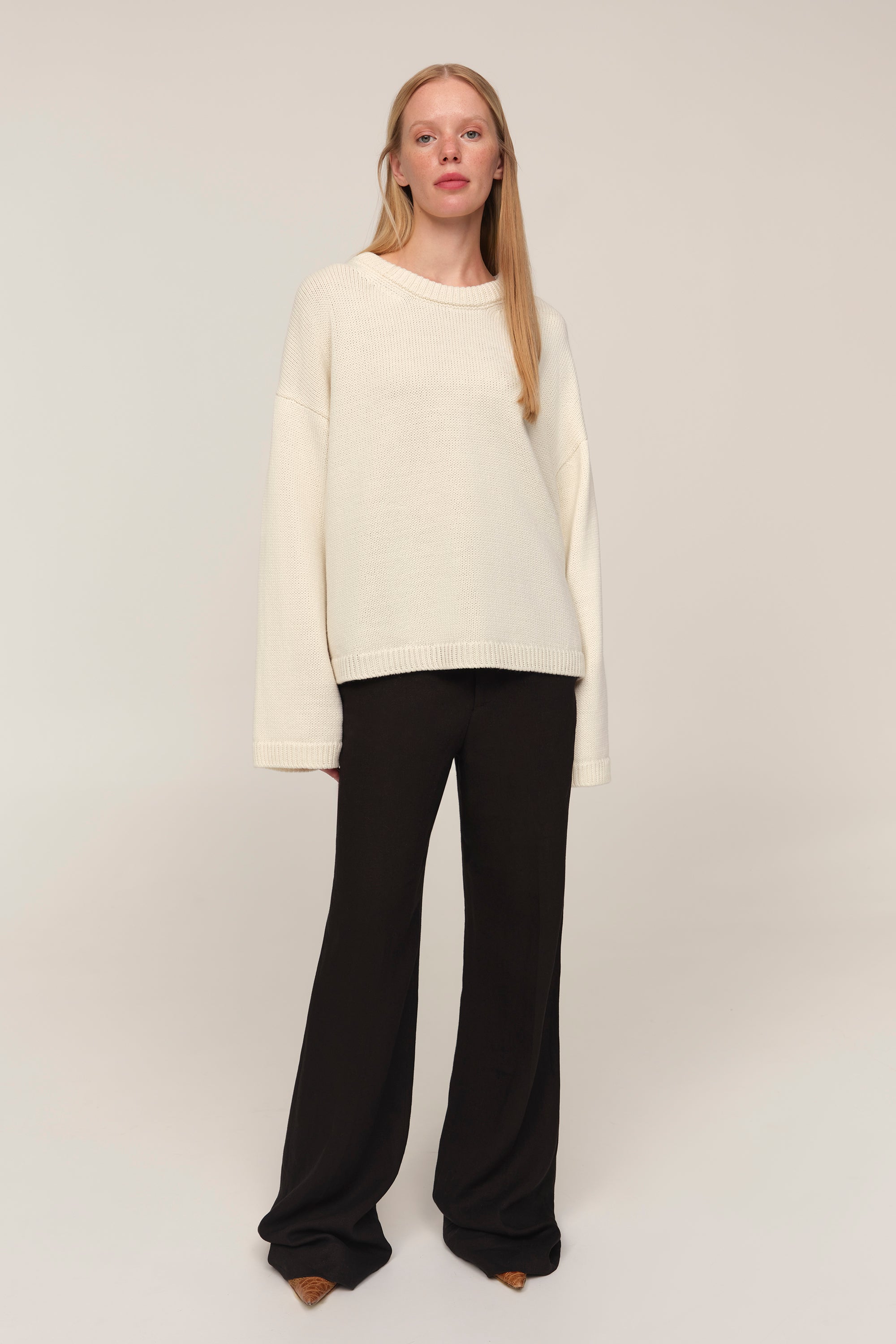 Elva — светр, що поєднує свободу та графічність форми. Його укорочена довжина врівноважує об’ємні рукава й занижене плече, створюючи актуальний силует із легкою архітектурою. Мериносова вовна додає балансу між теплом і легкістю, перетворюючи Elva на светр, доречний і в базових поєднаннях з денімом, і в більш продуманих стилізаціях.