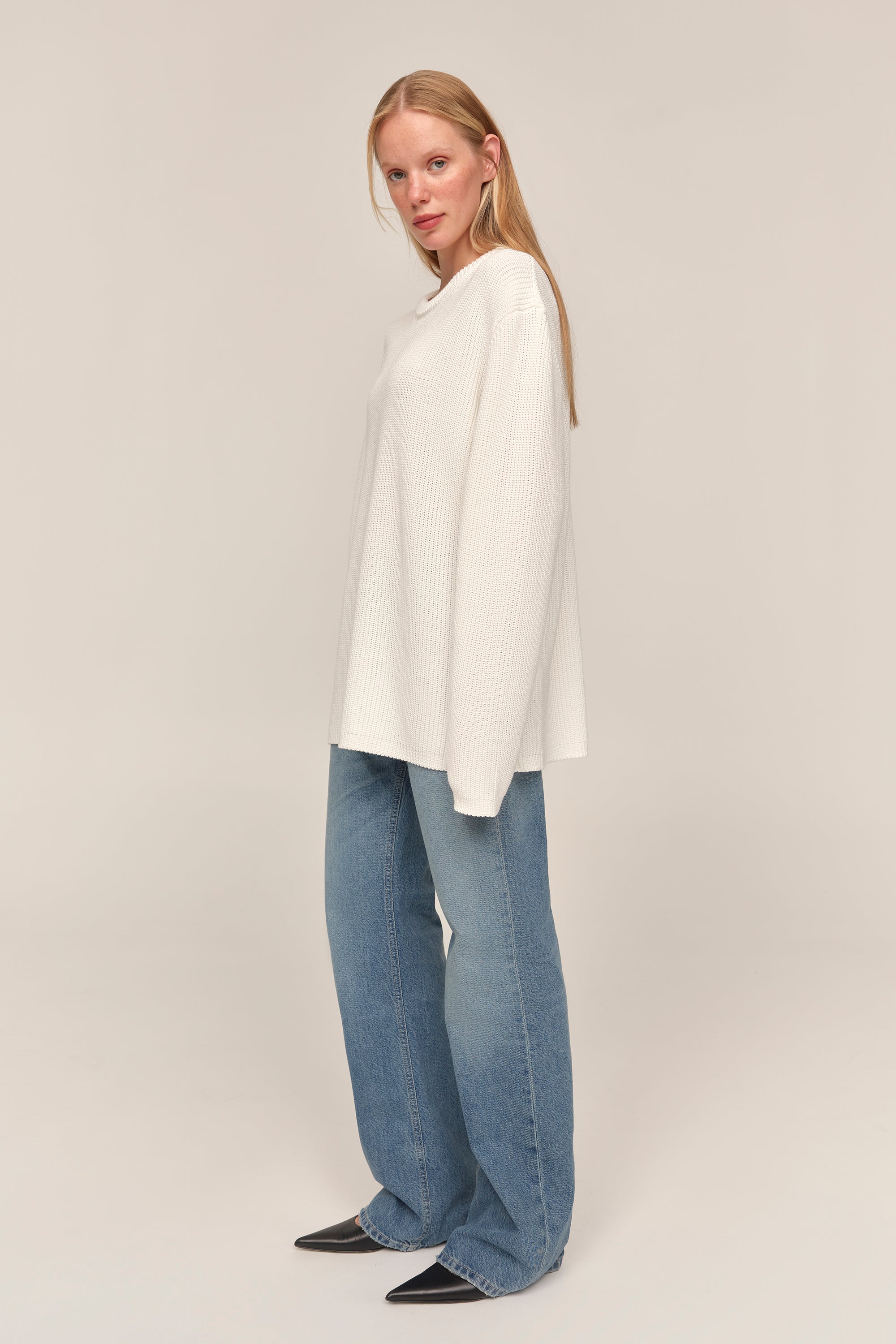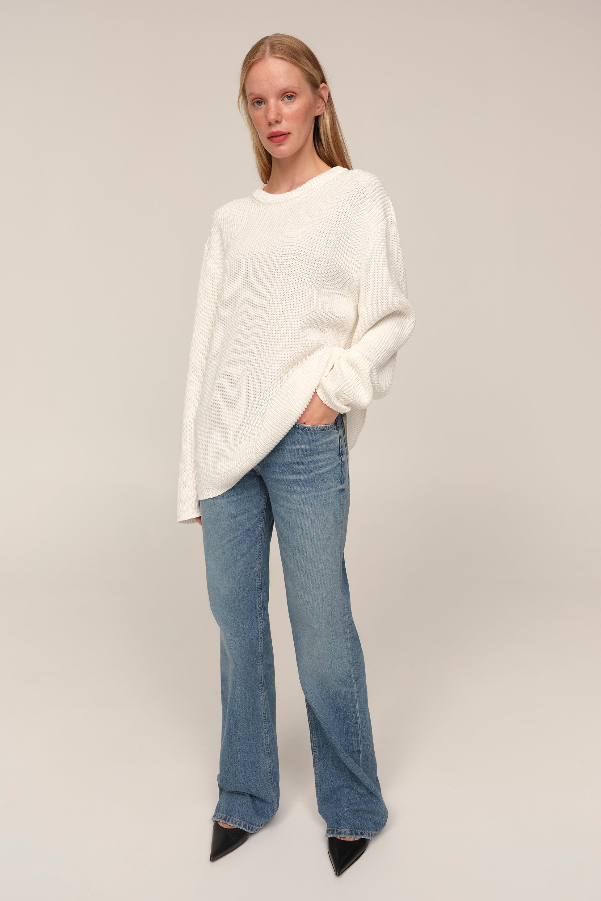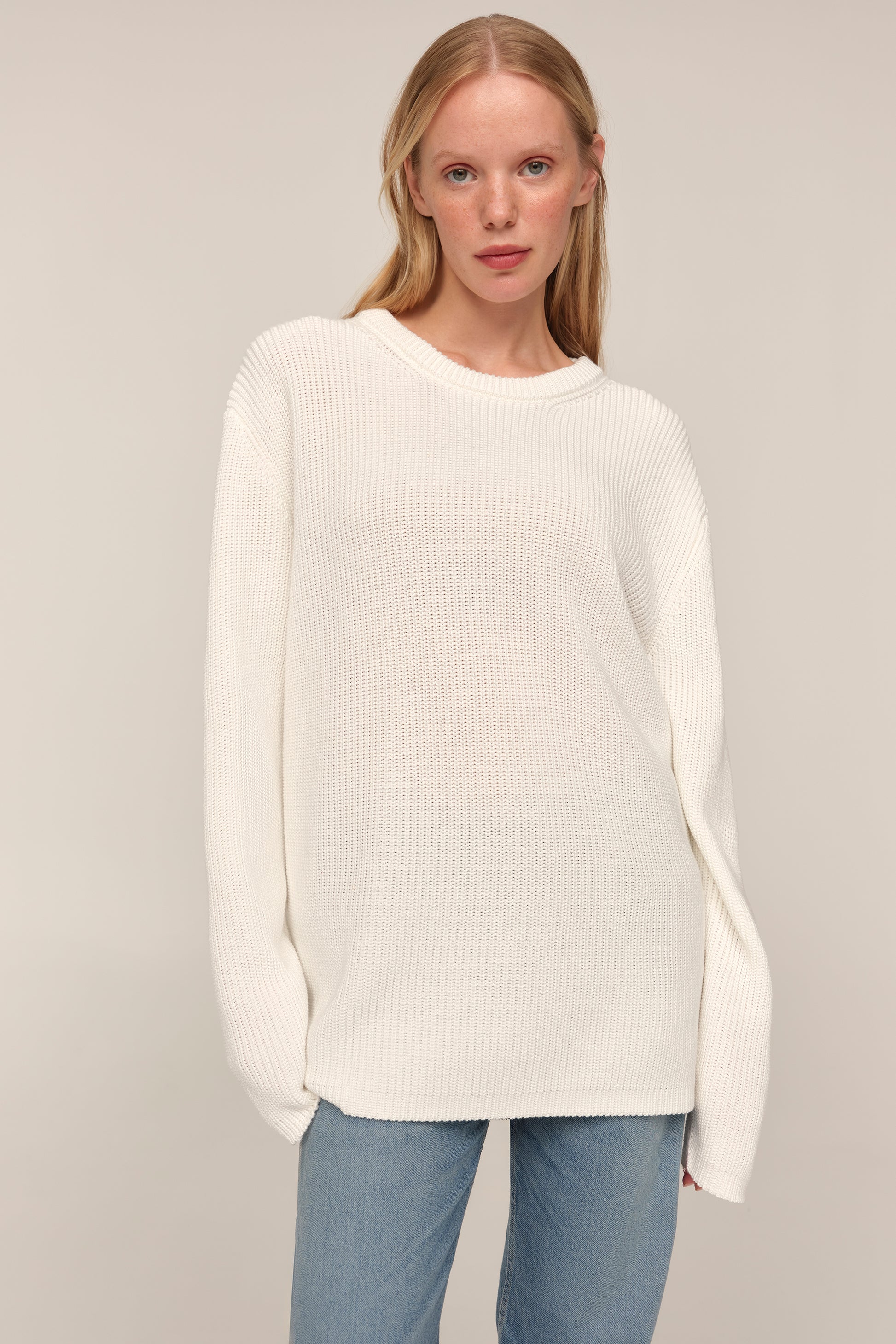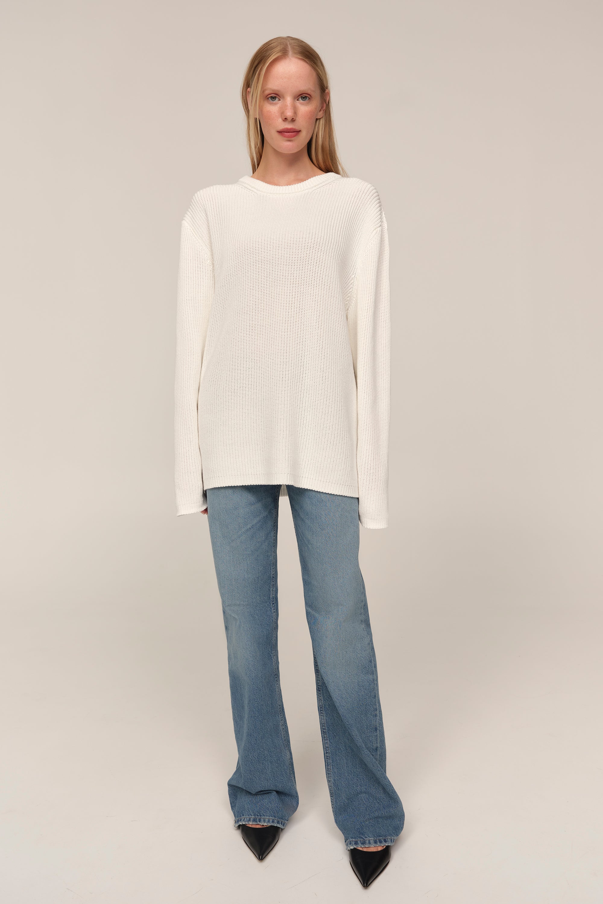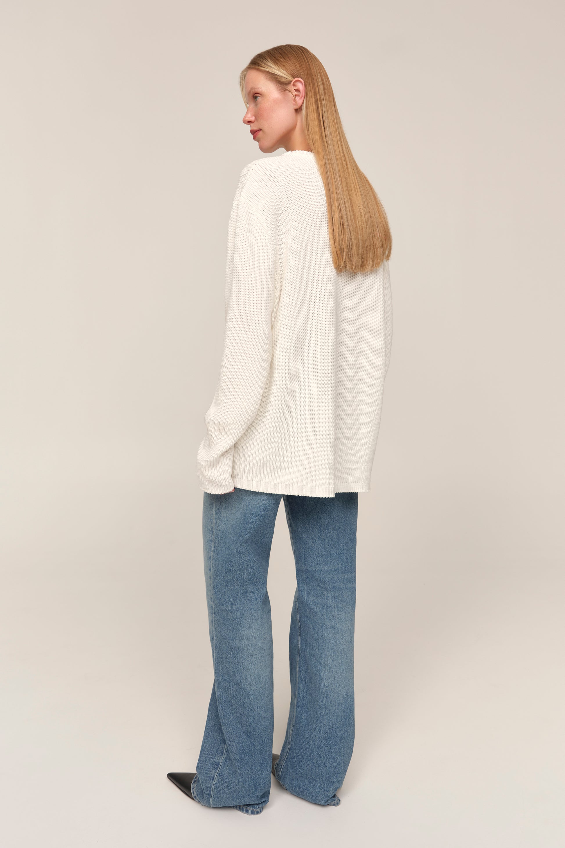 Kaia — светр із бавовни, у якому відчувається чесність матеріалу й чистота форми. Його об’єм підкреслений структурною в’язкою, що додає глибини силуету, а подовжені рукава додають розслабленості образу. Вільна посадка дозволяє легко інтегрувати светр у багатошарові поєднання або носити його як самостійну річ. Це не просто база, а річ, яка тримає форму гардеробу — стримана, але водночас виразна у деталях.