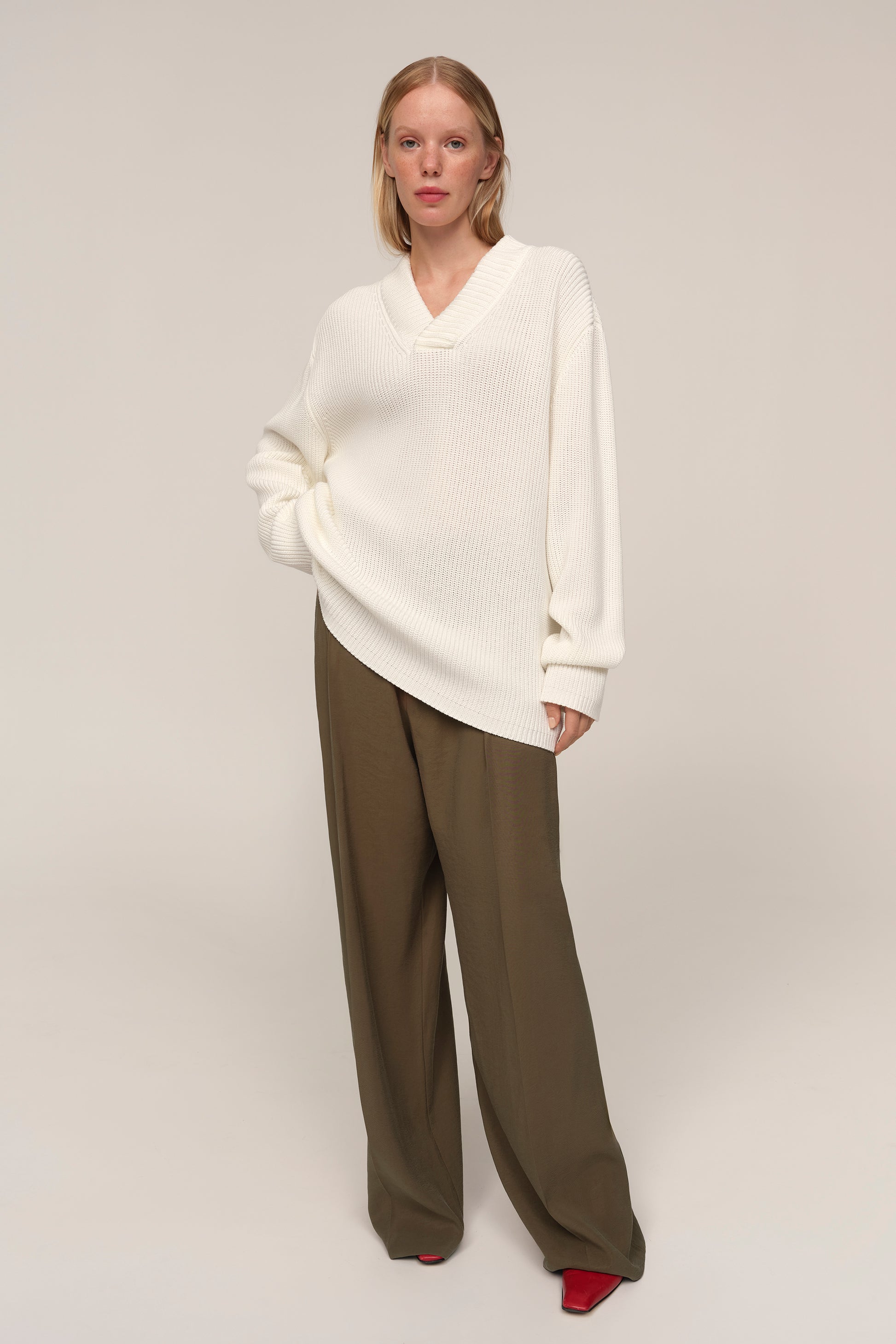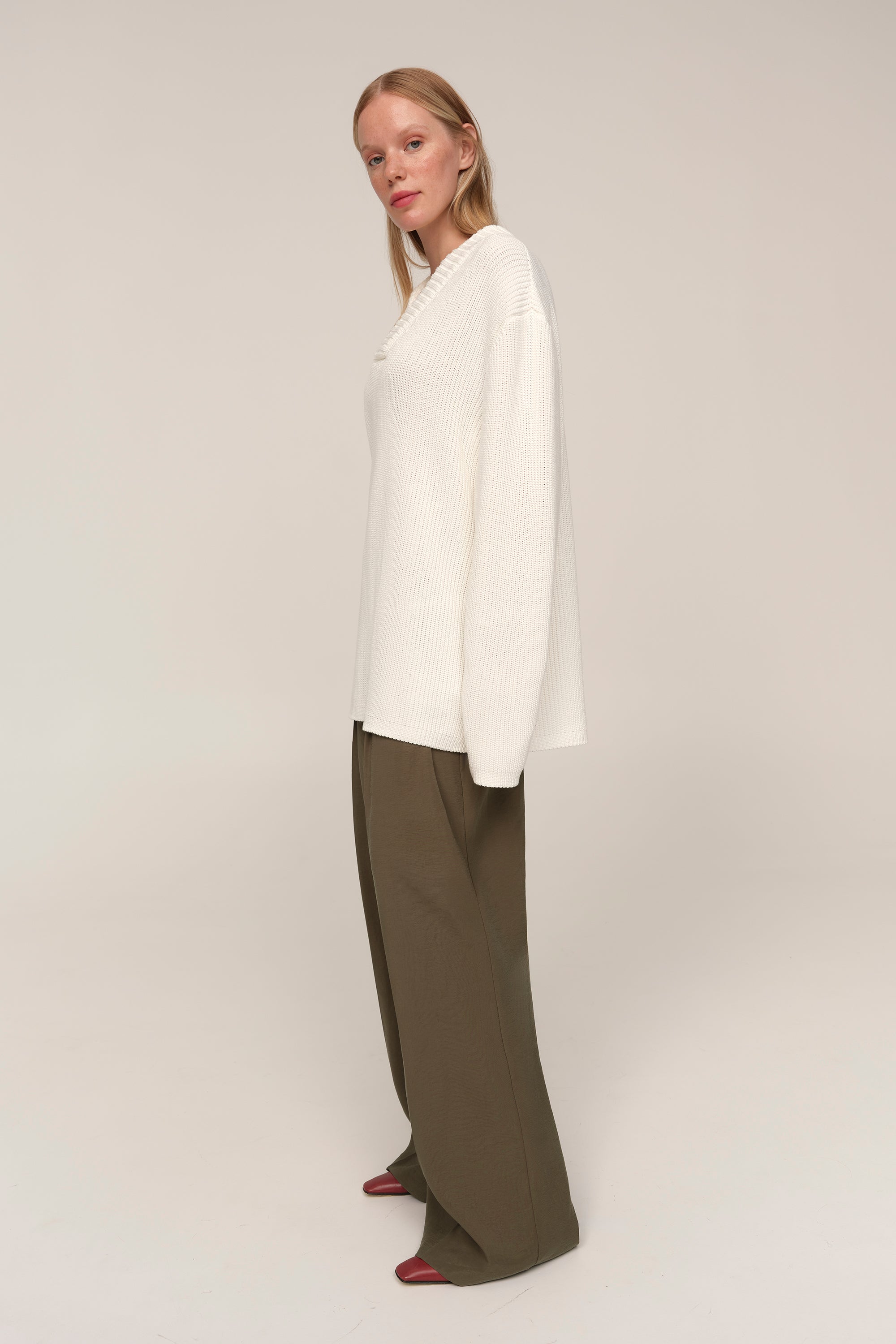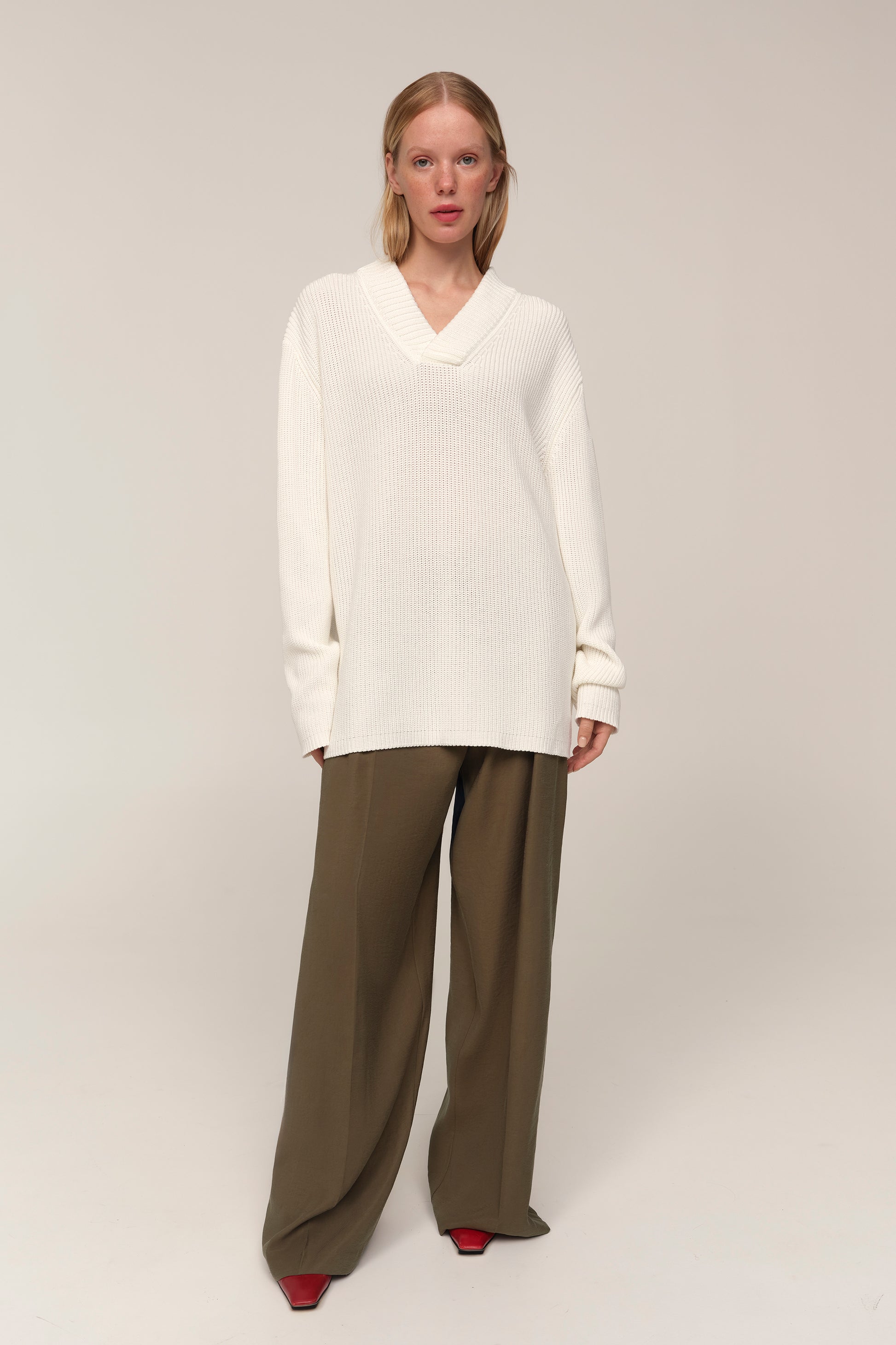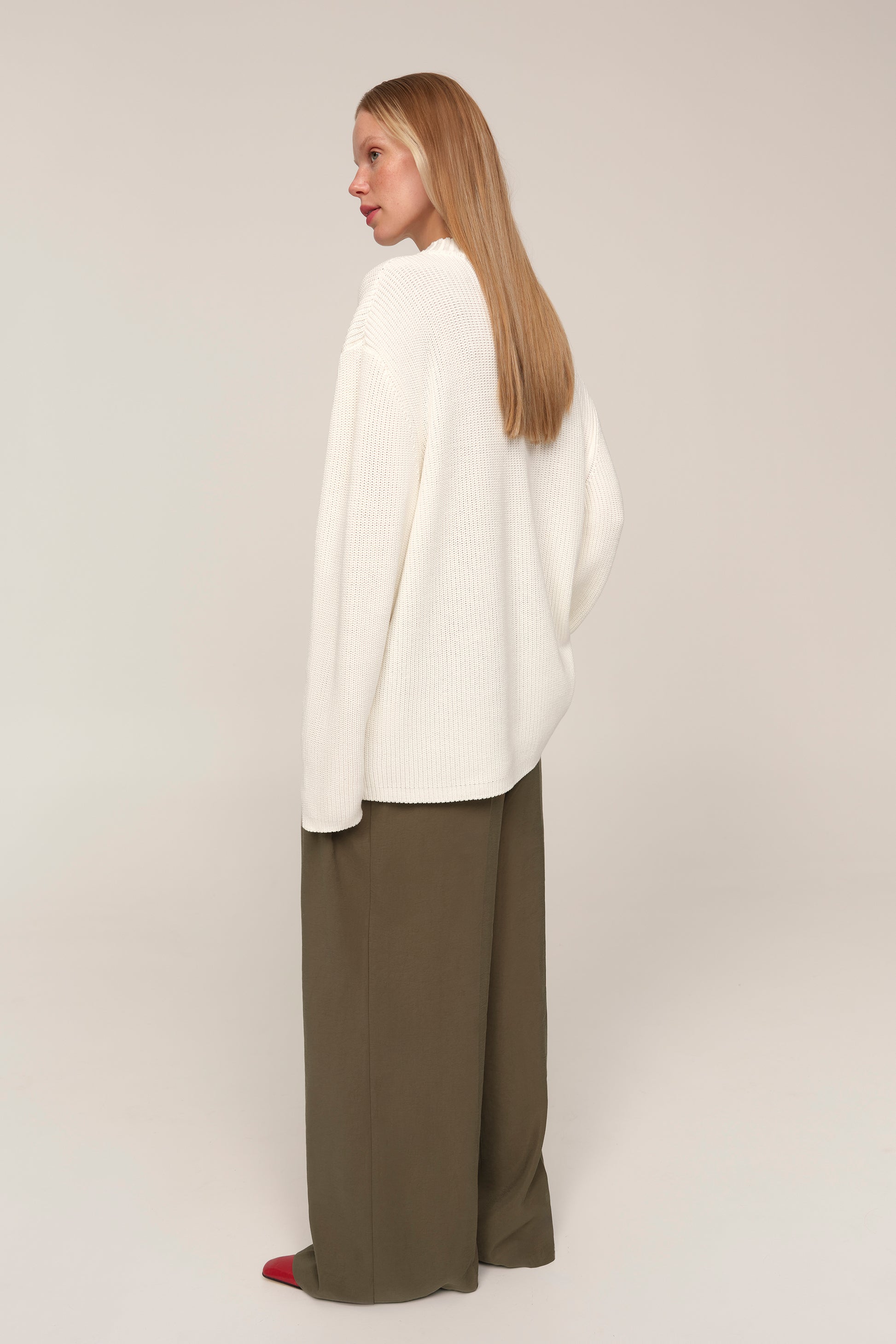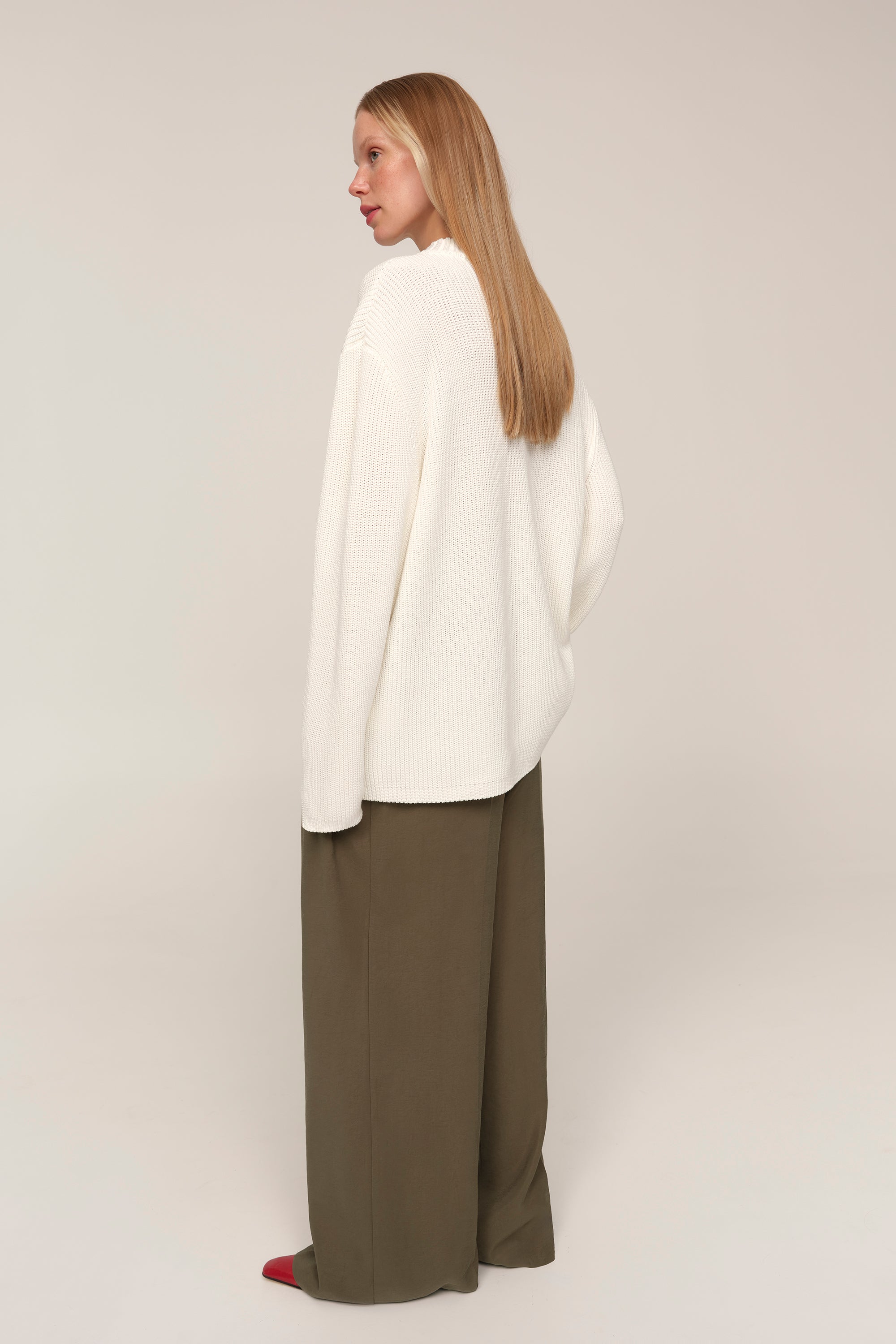 Створюючи цей бавовняний светр, ми свідомо працювали з пропорціями: подовжили виріб, щоб силует мав більш виразну і впевнену лінію, а глибину вирізу витримали стримано — для балансу. Комір обрамлює шию з легкою чіткістю, додаючи образу зосередженості.