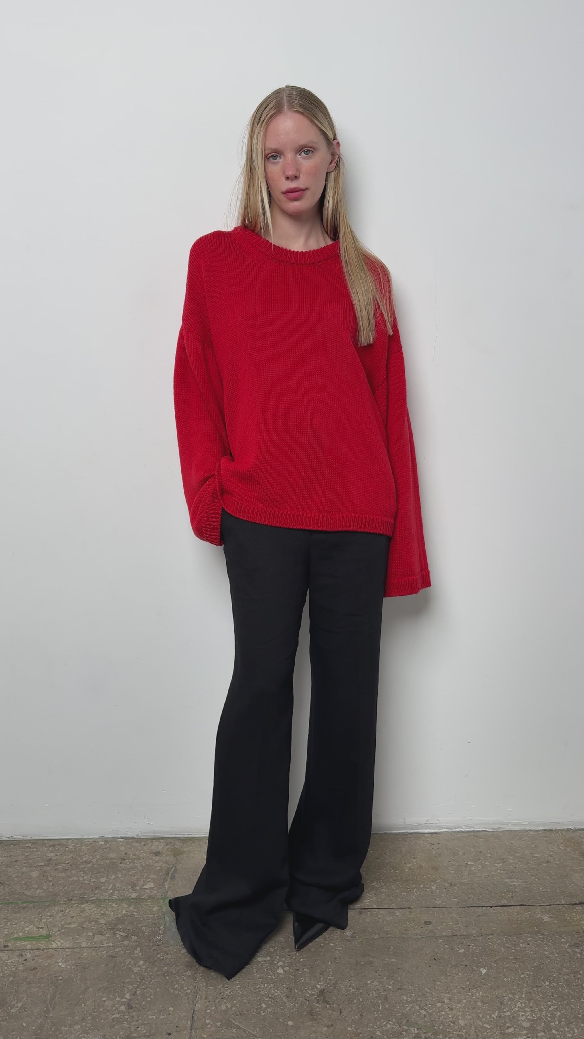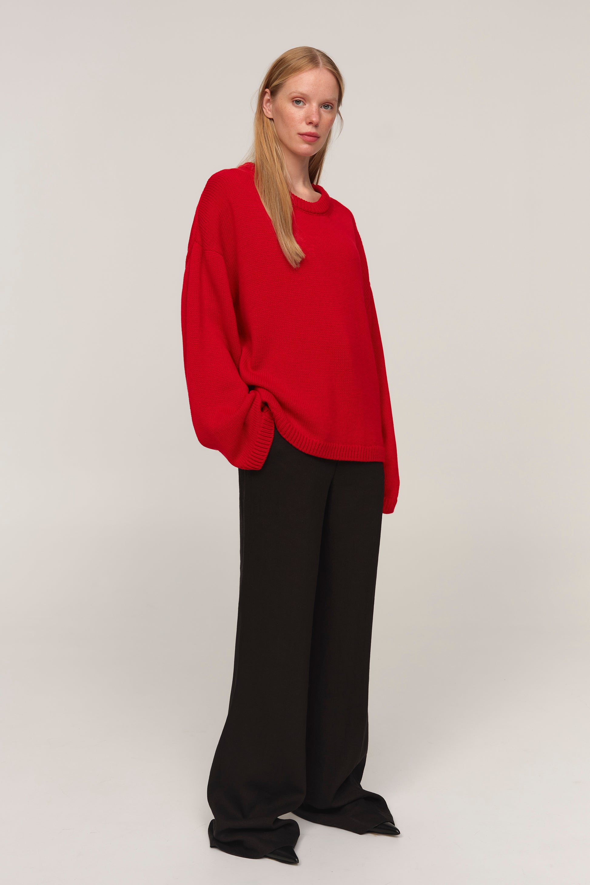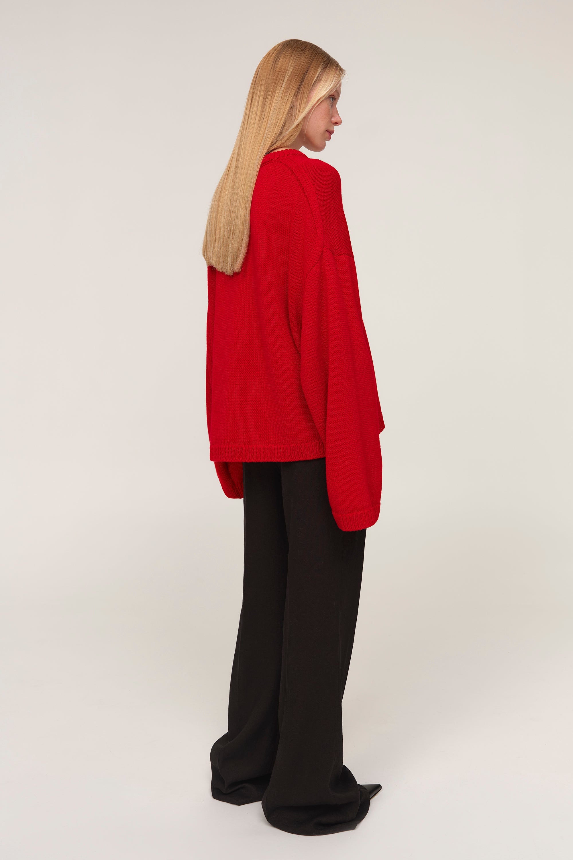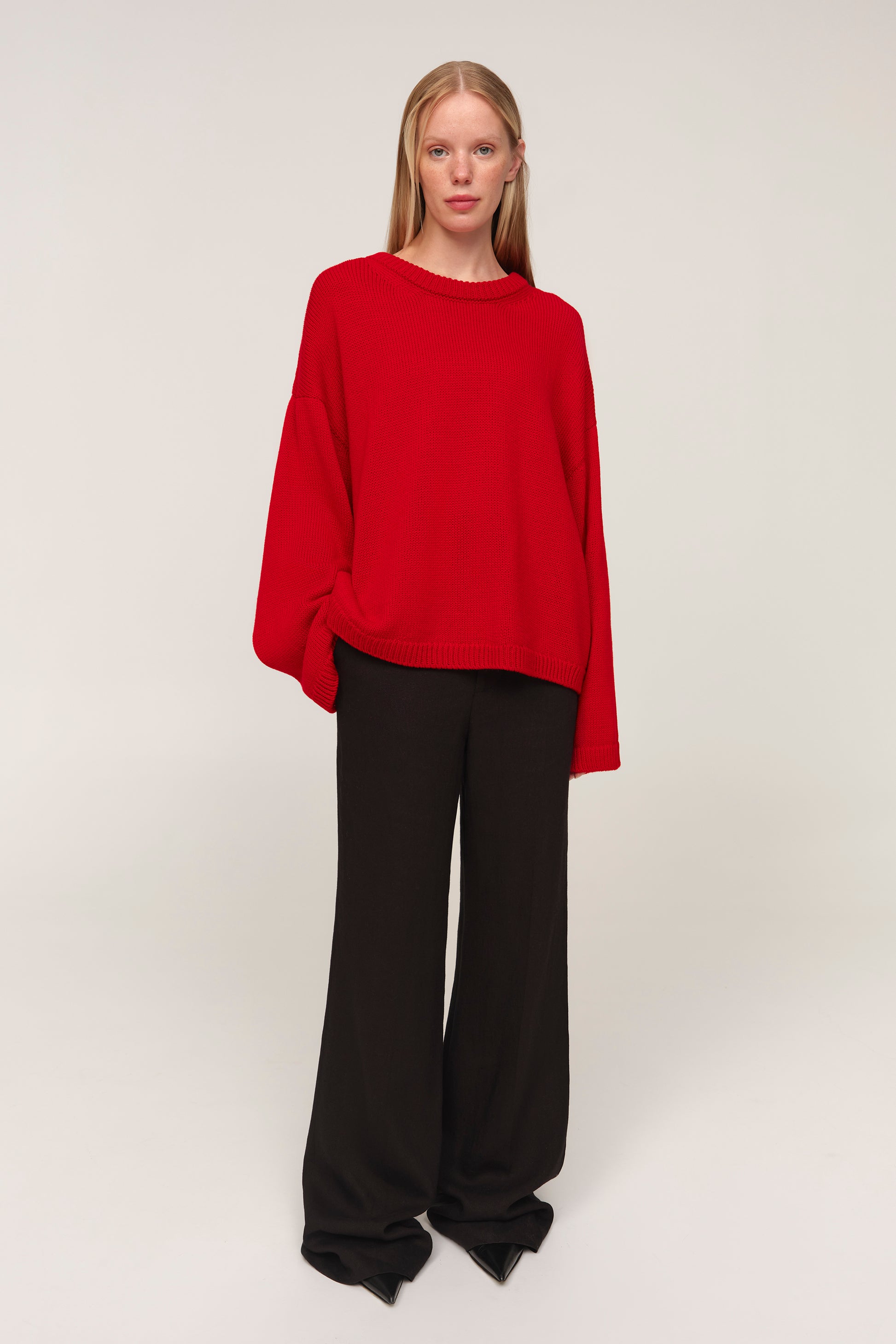 Elva — светр, що поєднує свободу та графічність форми. Його укорочена довжина врівноважує об’ємні рукава й занижене плече, створюючи актуальний силует із легкою архітектурою. Мериносова вовна додає балансу між теплом і легкістю, перетворюючи Elva на светр, доречний і в базових поєднаннях з денімом, і в більш продуманих стилізаціях.