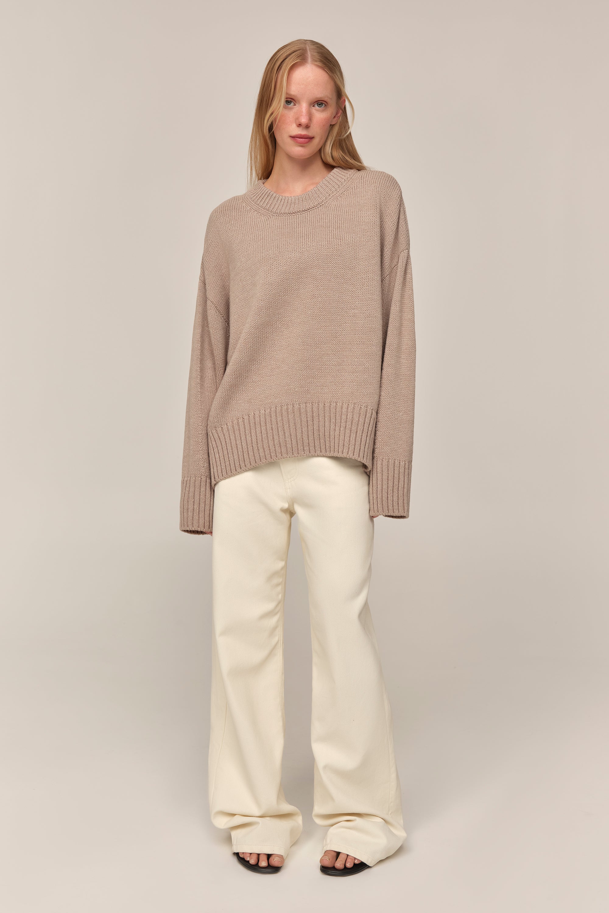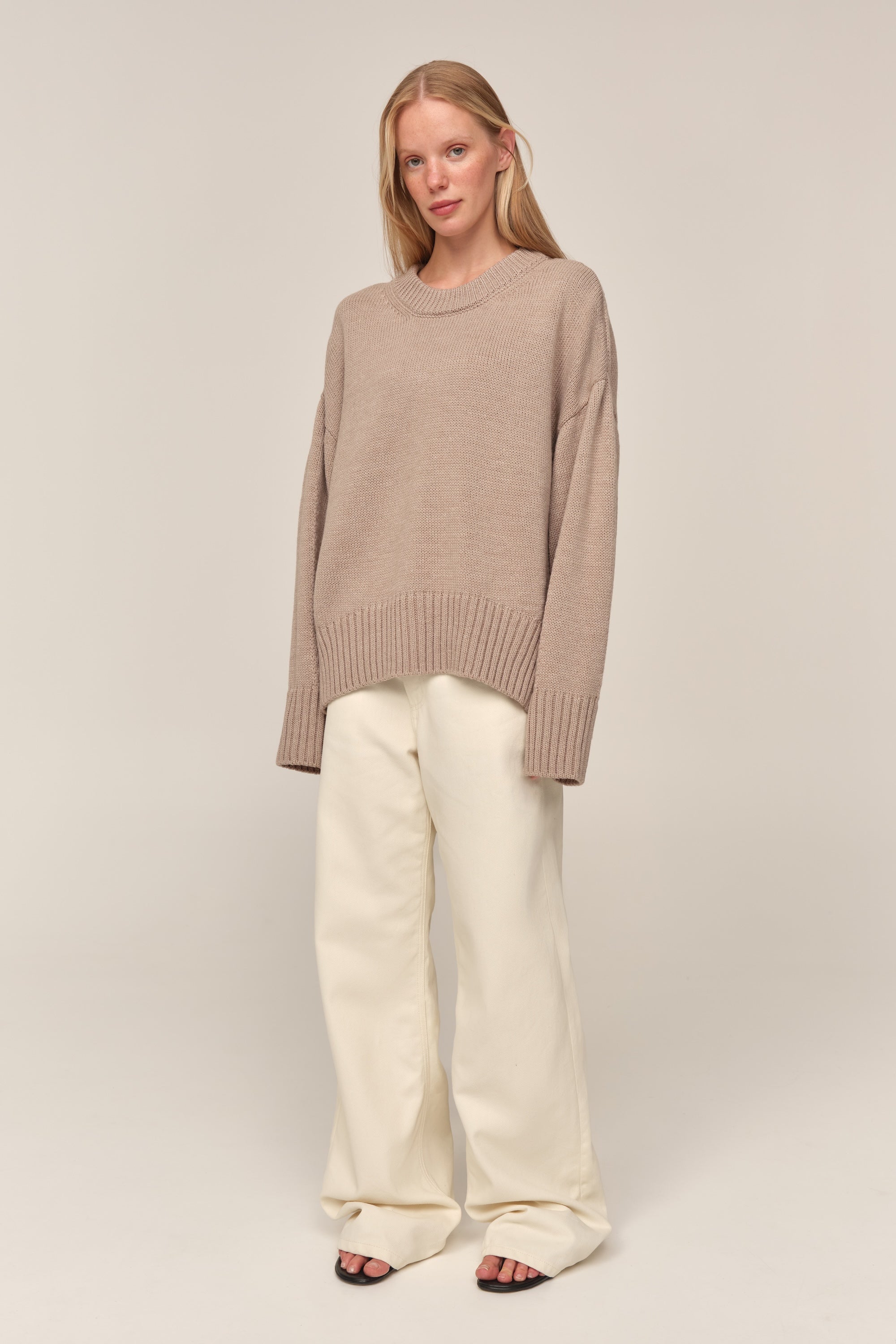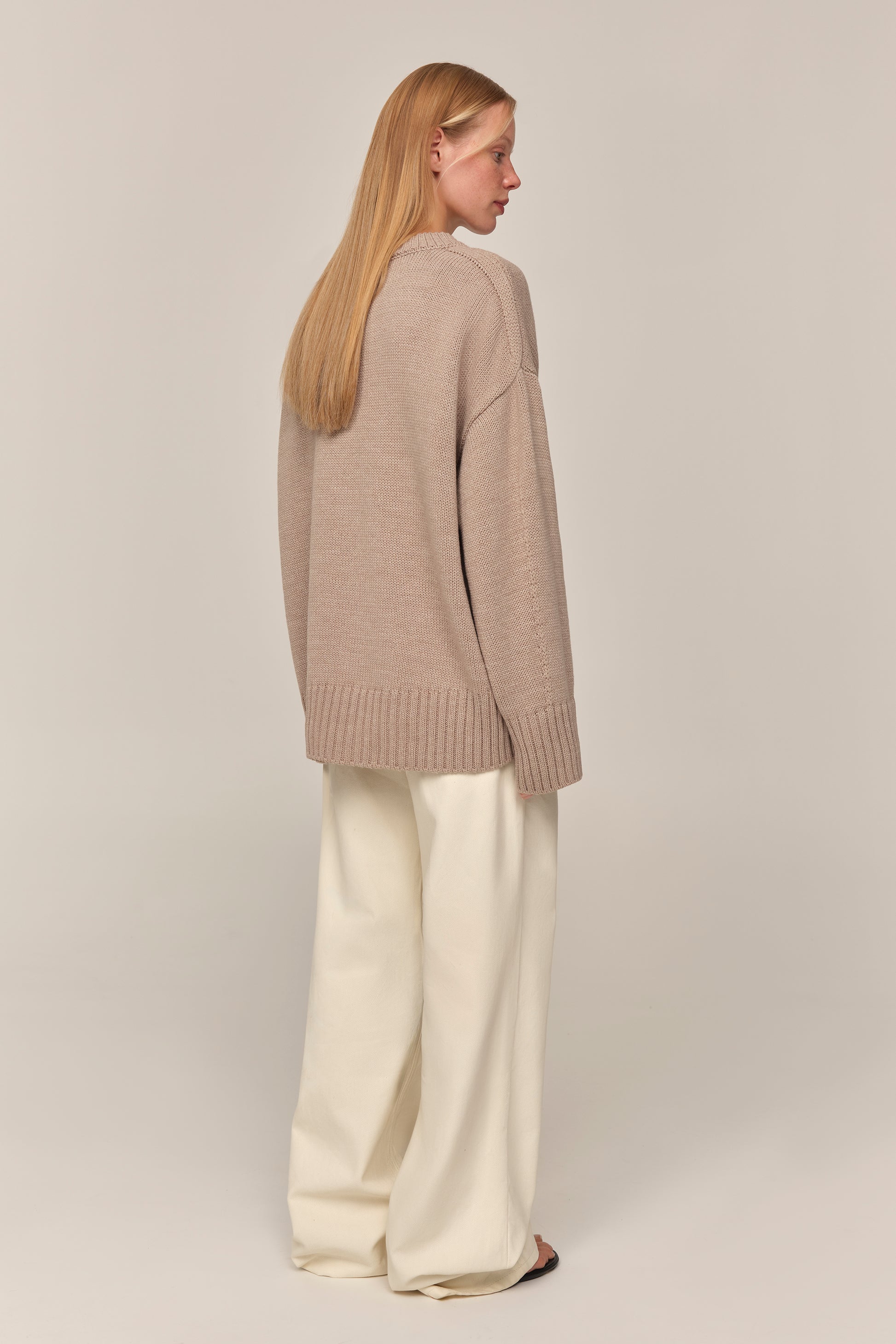 Sena — светр у його найчистішому значенні. Об’ємний силует, м’яке плетіння та виразна фактура роблять його річчю, яка сама формує образ. Асиметрія між передом і спинкою надає силуету виразності та підкреслює продуманість форми. Подовжені рукава створюють відчуття затишку, а завдяки мериносовій вовні светр відчувається особливо природним, додаючи тепла без зайвої ваги. Це не випадкова «база», а саме той светр, що стає опорою гардеробу: стриманий на перший погляд, але з характером, який розкривається у кожній комбінації.